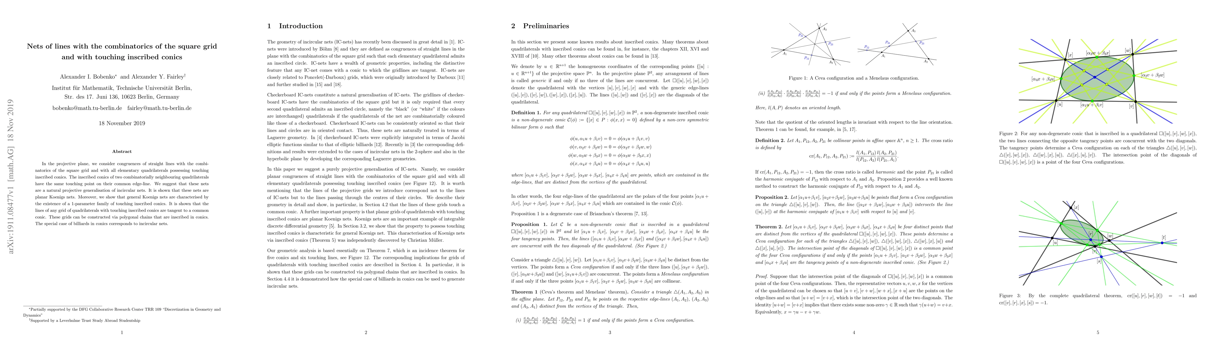 This paper explores projective congruences of straight lines in the plane that mimic the combinatorics of square grids and feature quadrilaterals with touching inscribed conics. The study reveals these nets as planar Koenigs nets, characterized by a 1-parameter family of touching conics, and shows that lines in such grids are tangent to a common conic.
