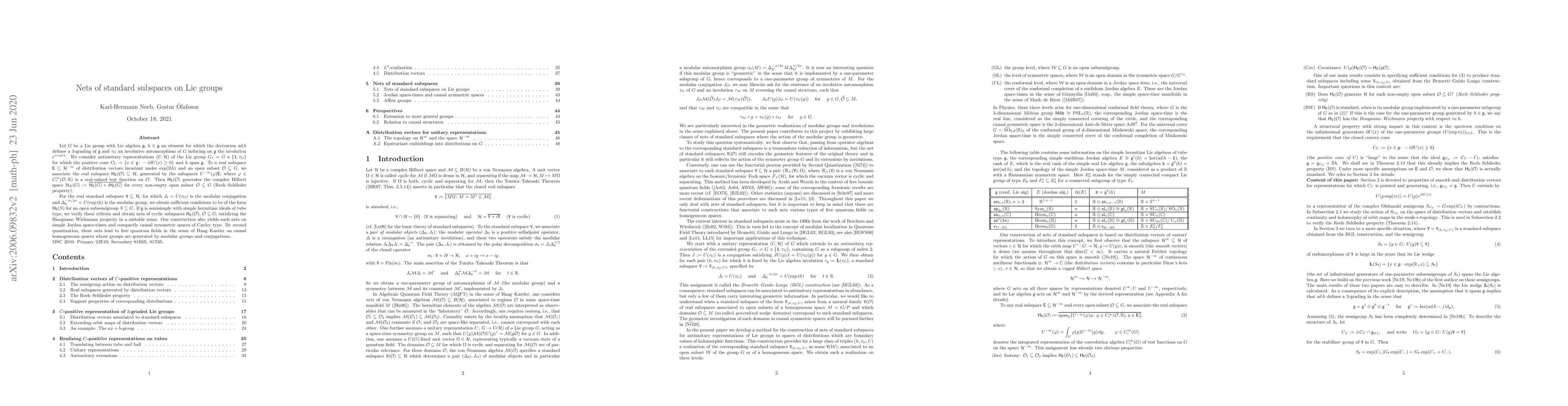Let G be a Lie group with Lie algebra $\mathfrak{g}$, $h \in \frak{g}$ an element for which the derivation ad(h) defines a 3-grading of $\mathfrak{g}$ and $\tau_G$ an involutive automorphism of G inducing on $\mathfrak{g}$ the involution $e^{\pi i ad(h)}$. We consider antiunitary representations $U$ of the Lie group $G_\tau = G \rtimes \{e,\tau_G\}$ for which the positive cone $C_U = \{ x \in \mathfrak{g} : -i \partial U(x) \geq 0\}$ and $h$ span $\mathfrak{g}$. To a real subspace E of distribution vectors invariant under $exp(\mathbb{R} h)$ and an open subset $O \subseteq G$, we associate the real subspace $H_E(O) \subseteq H$, generated by the subspaces $U(\varphi)E$, where $\varphi \in C^\infty_c(O,\mathbb{R})$ is a real-valued test function on $O$. Then $H_E(O)$ is dense in $H_E(G)$ for every non-empty open subset $O \subseteq G$ (Reeh--Schlider property). For the real standard subspace $V \subseteq H$, for which $J_V = U(\tau_G)$ is the modular conjugation and $\Delta_V^{-it/2\pi} = U(\exp th)$ is the modular group, we obtain sufficient conditions to be of the form $H_E(S)$ for an open subsemigroup $S \subseteq G$. If $\mathfrak{g}$ is semisimple with simple hermitian ideals of tube type, we verify these criteria and obtain nets of cyclic subspacs $H_E(O)$, $O \subseteq G$, satisfying the Bisognano--Wichman property for some domains O. Our construction also yields such nets on simple Jordan space-times and compactly causal symmetric spaces of Cayley type. By second quantization, these nets lead to free quantum fields in the sense of Haag--Kastler on causal homogeneous spaces whose groups are generated by modular groups and conjugations.