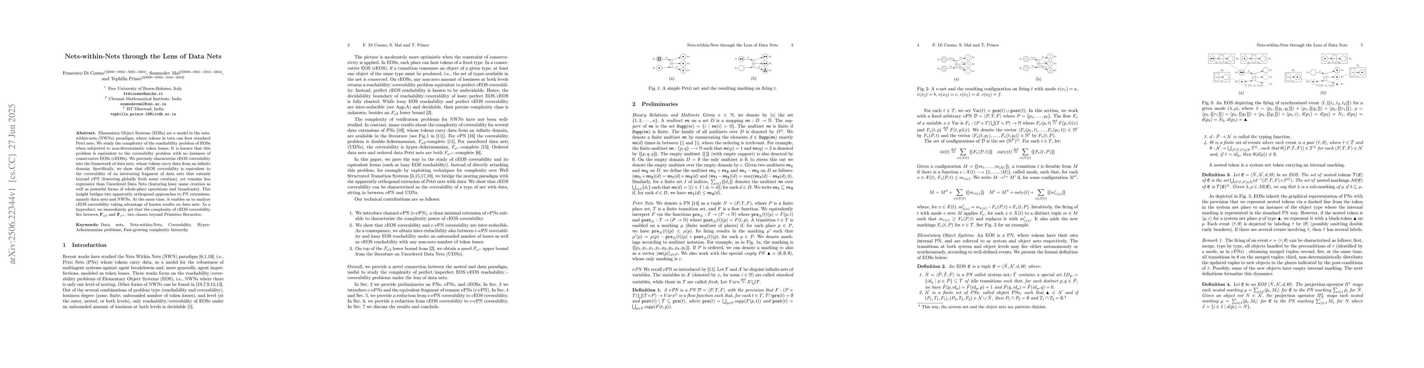Elementary Object Systems (EOSs) are a model in the nets-within-nets (NWNs) paradigm, where tokens in turn can host standard Petri nets. We study the complexity of the reachability problem of EOSs when subjected to non-deterministic token losses. It is known that this problem is equivalent to the coverability problem with no lossiness of conservative EOSs (cEOSs). We precisely characterize cEOS coverability into the framework of data nets, whose tokens carry data from an infinite domain. Specifically, we show that cEOS coverability is equivalent to the coverability of an interesting fragment of data nets that extends beyond $\nu$PNs (featuring globally fresh name creation), yet remains less expressive than Unordered Data Nets (featuring lossy name creation as well as powerful forms of whole-place operations and broadcasts). This insight bridges two apparently orthogonal approaches to PN extensions, namely data nets and NWNs. At the same time, it enables us to analyze cEOS coverability taking advantage of known results on data nets. As a byproduct, we immediately get that the complexity of cEOS coverability lies between $\mathbf{F}_{\omega 2}$ and $\mathbf{F}_{\omega^\omega}$, two classes beyond Primitive Recursive.