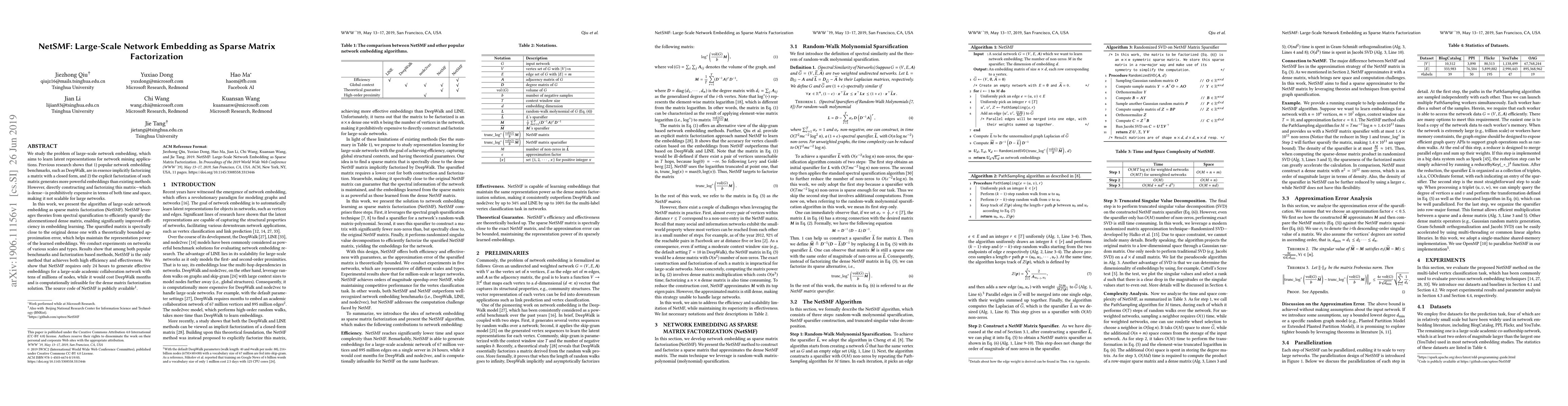NetSMF introduces an efficient large-scale network embedding method by using sparse matrix factorization, overcoming the scalability issues of dense matrix factorization. It leverages spectral sparsification to maintain representation power while significantly improving computational efficiency.