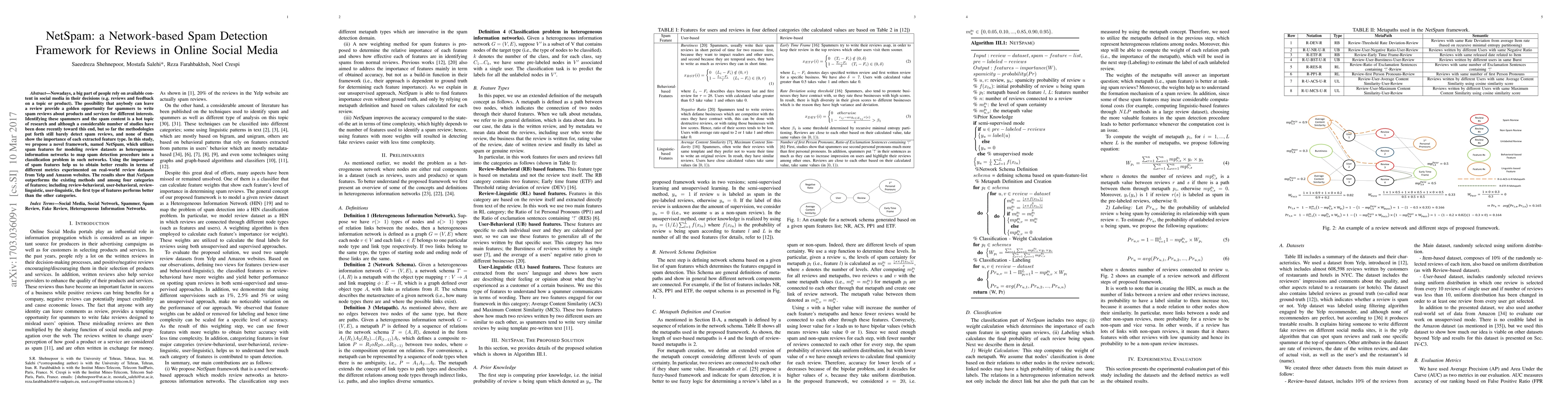 NetSpam is a novel framework for detecting spam reviews in online social media by modeling review datasets as heterogeneous information networks. It outperforms existing methods by utilizing the importance of various spam features, with review-behavioral features proving most effective.