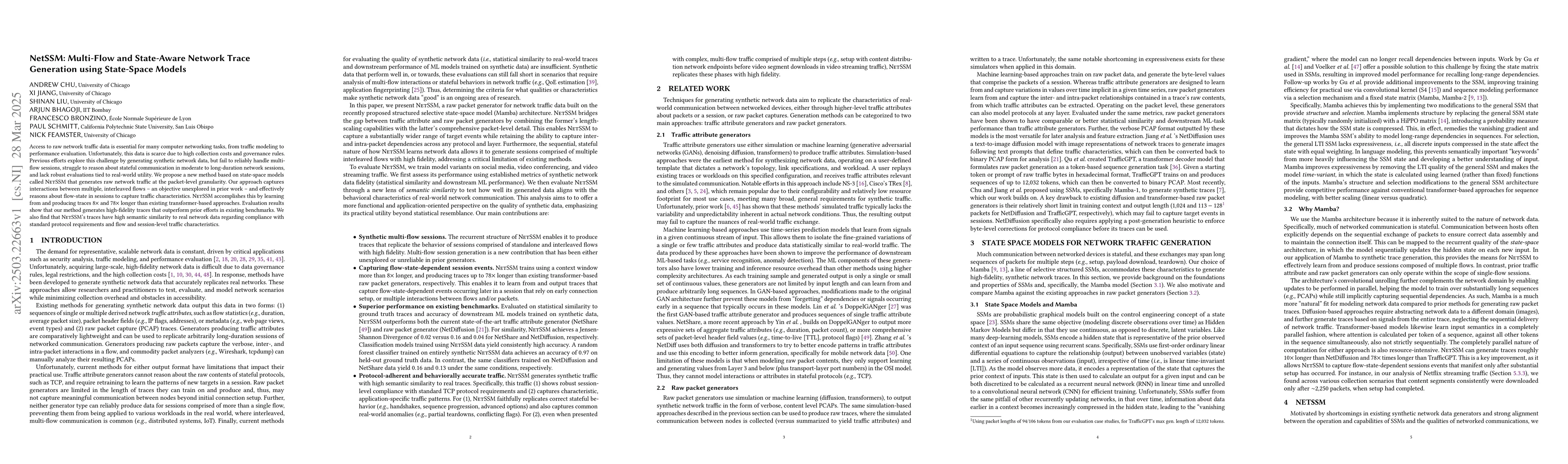 NetSSM is the first network data generator capable of producing PCAPs for sessions comprised of multiple interleaved flows, using a sequential, stateful architecture that learns from and produces longer sessions than current transformer-based generators.