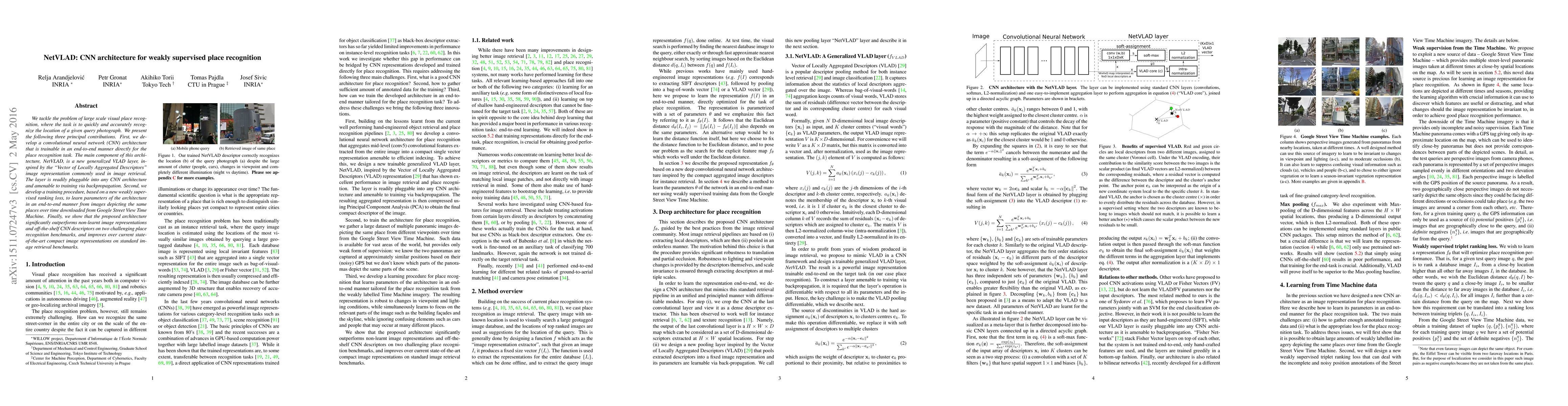 This research introduces NetVLAD, a CNN architecture designed for large-scale visual place recognition. The key innovation is a generalized VLAD layer that enhances the network's ability to recognize locations from photographs. The proposed method trains end-to-end using a weakly supervised ranking loss and outperforms existing methods on place recognition and image retrieval benchmarks.