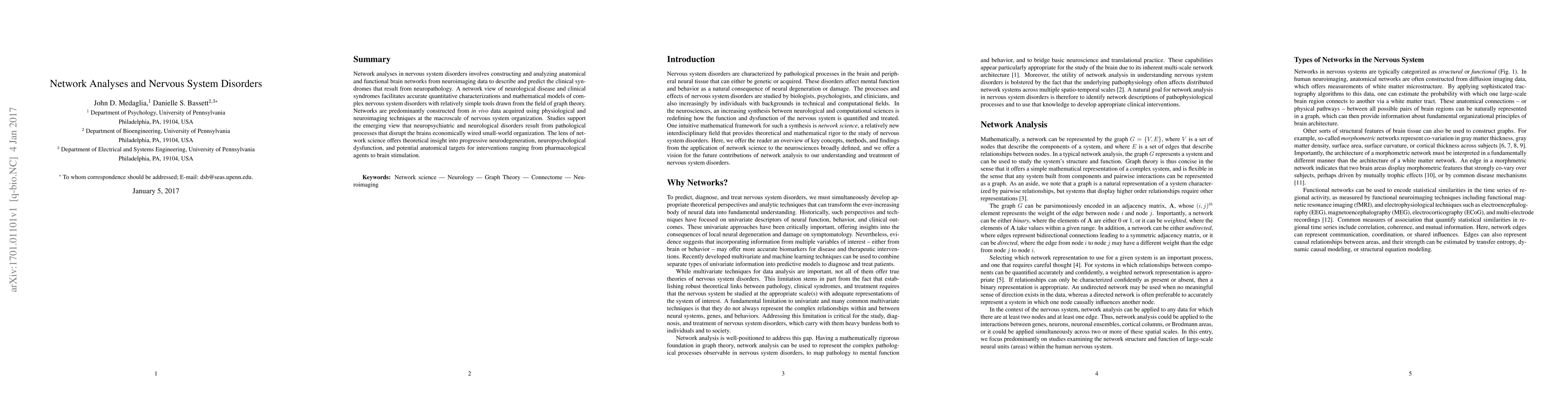 This paper explores how network analyses using graph theory can quantitatively characterize and model complex nervous system disorders by examining brain networks derived from neuroimaging data. It highlights that disruptions in the brain's small-world organization underpin neuropsychiatric and neurological disorders, offering insights into neurodegeneration and potential intervention targets.
