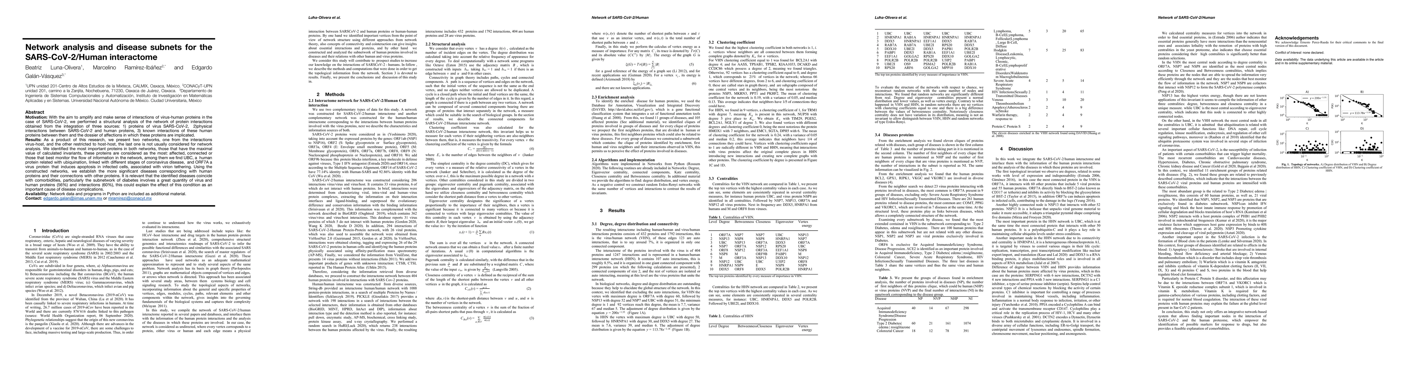 Motivation: With the aim to amplify and make sense of interactions of virus-human proteins in the case of SARS-CoV-2, we performed a structural analysis of the network of protein interactions obtained from the integration of three sources: 1) proteins of virus SARS-CoV-2, 2)physical interactions between SARS-CoV-2 and human proteins, 3) known interactions of these human proteins between them and the dossier of affections in which these proteins are implicated. Results: As a product of this research, we present two networks, one from the interactions virus-host, and the other restricted to host-host, the last one is not usually considered for network analysis. We identified the most important proteins in both networks, those that have the maximal value of calculated invariants, these proteins are considered as the most: affected, connected or those that best monitor the flow of information in the network, among them we find UBC, a human protein related with ubiquination, linked with different stages of coronavirus disease, and ORF7A a virus protein that induces apoptosis in infected cells, associated with virion tethering. Using the constructed networks, we establish the more significant diseases corresponding with human proteins and their connections with other proteins. It is relevant that the identified diseases coincide with comorbidities, particularly the subnetwork of diabetes involves a great quantity of virus and human proteins (56%) and interactions (60%), this could explain the effect of this condition as an important cause of disease complications.