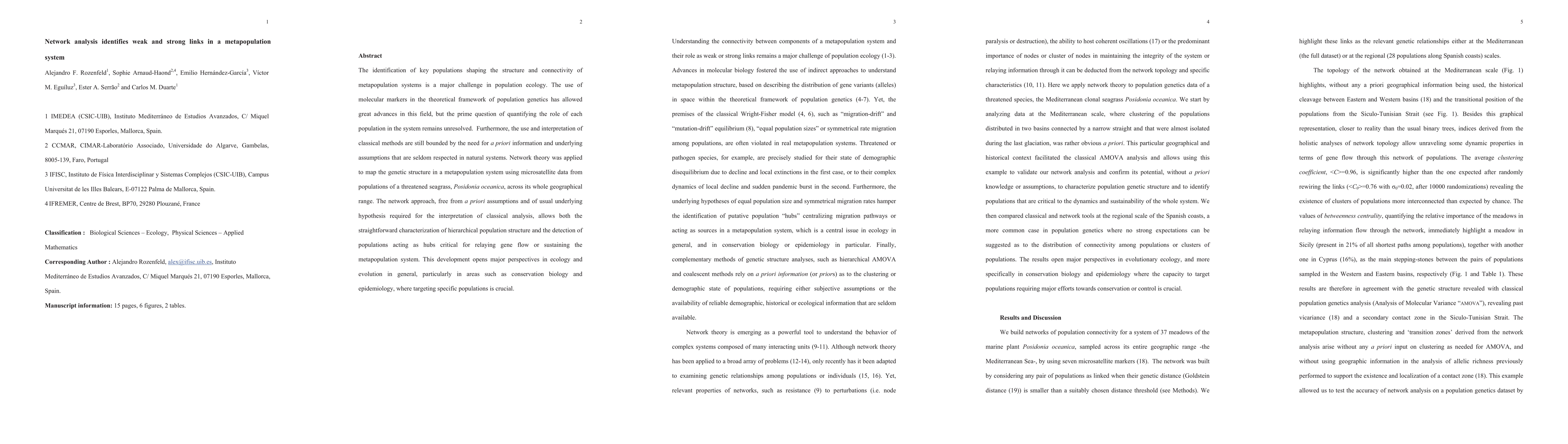 The identification of key populations shaping the structure and connectivity of metapopulation systems is a major challenge in population ecology. The use of molecular markers in the theoretical framework of population genetics has allowed great advances in this field, but the prime question of quantifying the role of each population in the system remains unresolved. Furthermore, the use and interpretation of classical methods are still bounded by the need for a priori information and underlying assumptions that are seldom respected in natural systems. Network theory was applied to map the genetic structure in a metapopulation system using microsatellite data from populations of a threatened seagrass, Posidonia oceanica, across its whole geographical range. The network approach, free from a priori assumptions and of usual underlying hypothesis required for the interpretation of classical analysis, allows both the straightforward characterization of hierarchical population structure and the detection of populations acting as hubs critical for relaying gene flow or sustaining the metapopulation system. This development opens major perspectives in ecology and evolution in general, particularly in areas such as conservation biology and epidemiology, where targeting specific populations is crucial.