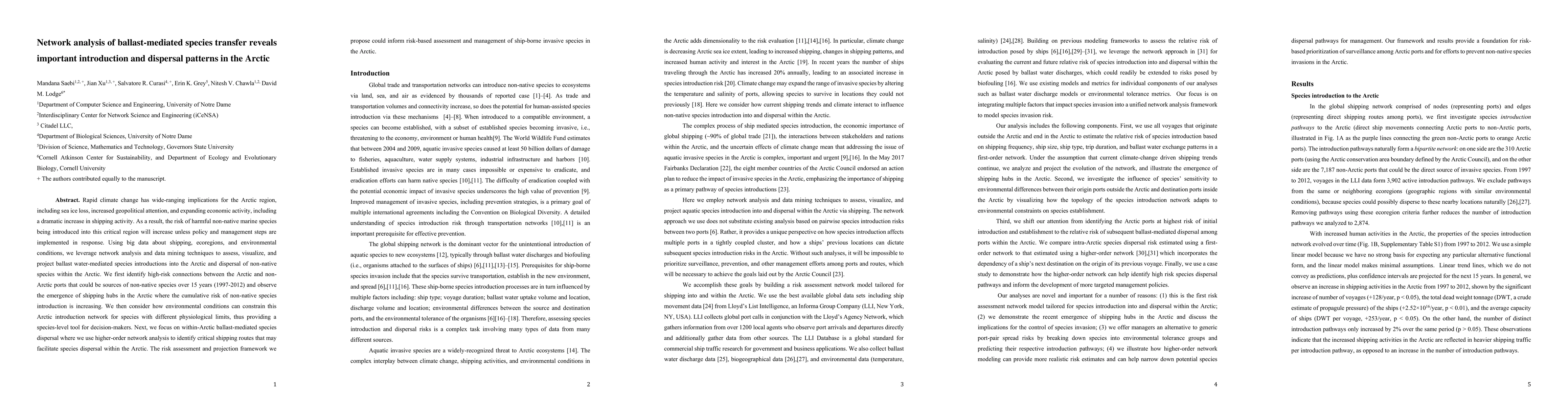 This paper uses network analysis and big data to identify high-risk pathways for non-native species introduction into the Arctic via shipping ballast water, highlighting emerging shipping hubs and critical dispersal routes. The study provides a framework for risk-based management of invasive species in the Arctic, informed by environmental constraints and species physiological limits.