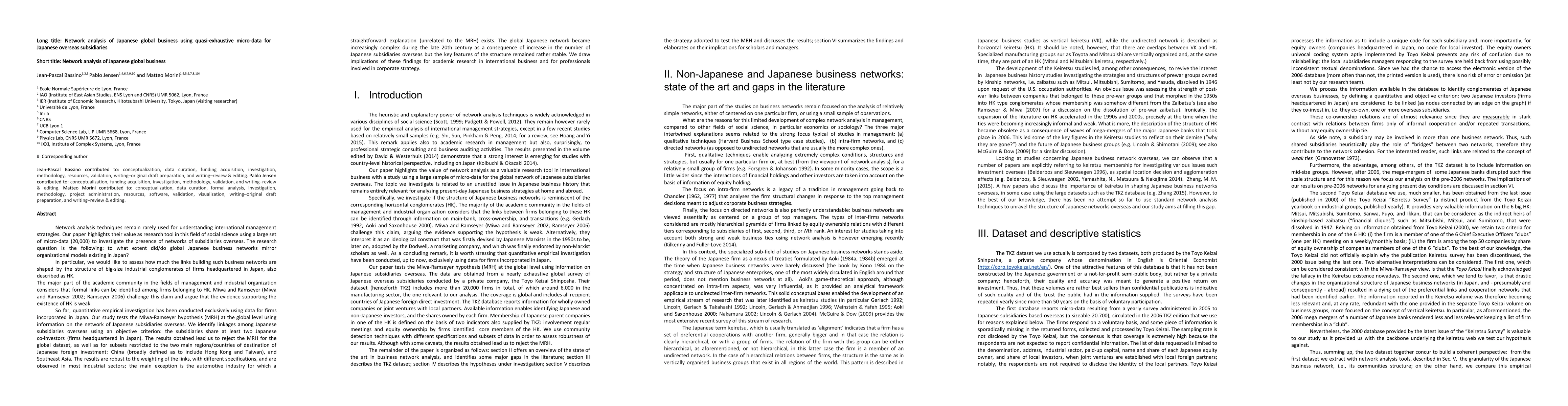 This paper uses network analysis on quasi-exhaustive micro-data to investigate the global Japanese business network, finding that it mirrors organizational models in Japan and supports the existence of large industrial conglomerates. The study rejects the Miwa-Ramseyer hypothesis, showing stable network structures despite increasing complexity.