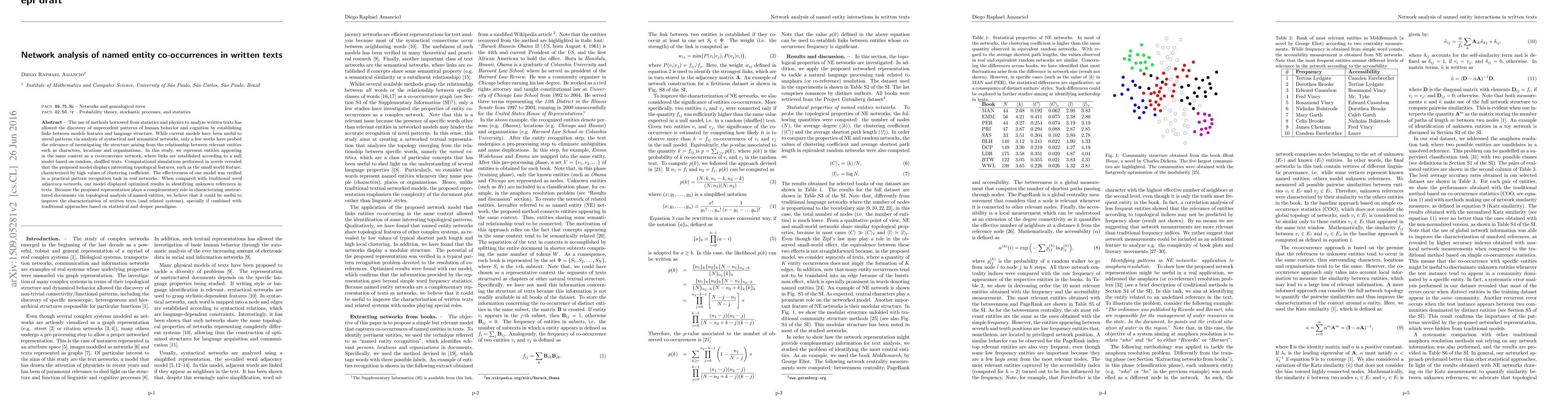 This study proposes a network analysis method to model co-occurrences of named entities in texts, revealing small-world features and superior performance in identifying unknown references compared to traditional word adjacency networks. The approach enhances the characterization of written texts through topological analysis of named entities.