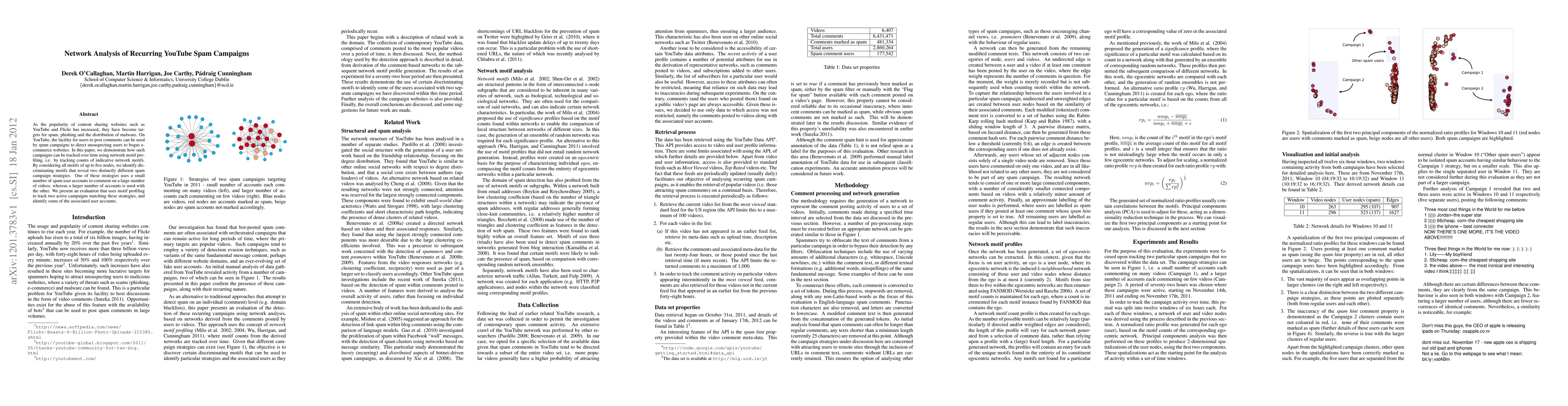 This paper employs network motif profiling to analyze recurring YouTube spam campaigns, identifying two distinct strategies: one using few accounts to comment on many videos, and another using many accounts for fewer comments. The study tracks these campaigns over time and identifies associated user accounts.
