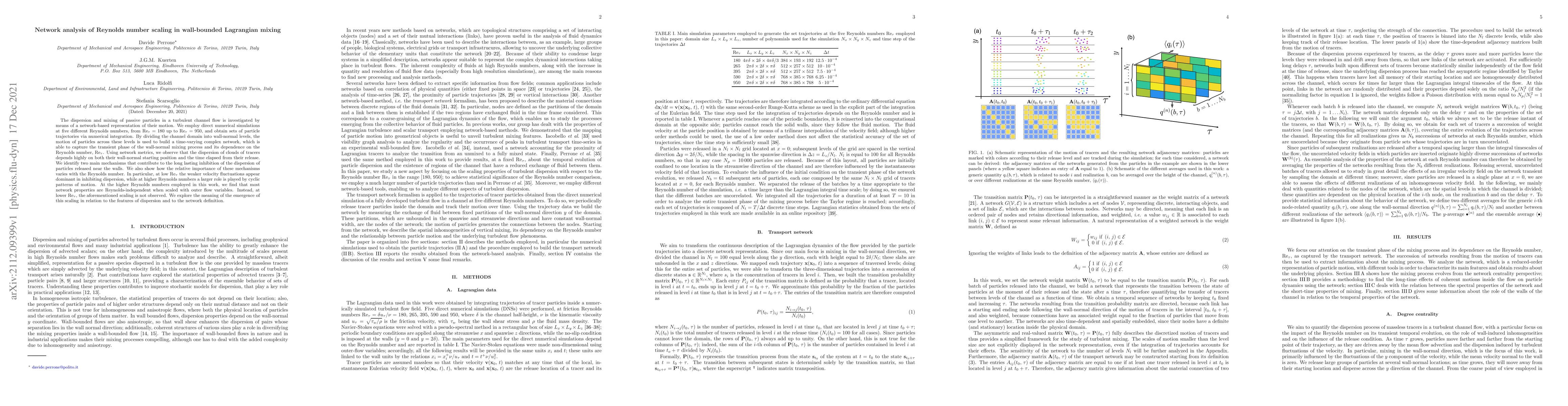 Researchers study how particles mix in a turbulent fluid flow using network analysis, finding that particle dispersion is influenced by Reynolds number and wall-normal position, with two main mechanisms contributing to its inhibition.