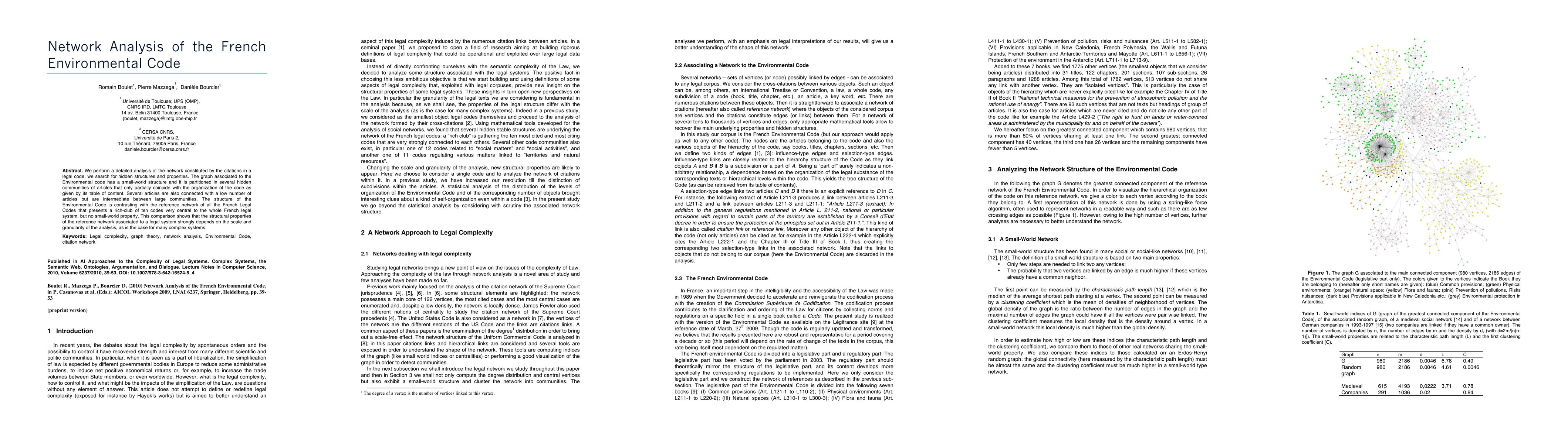 We perform a detailed analysis of the network constituted by the citations in a legal code, we search for hidden structures and properties. The graph associated to the Environmental code has a small-world structure and it is partitioned in several hidden communities of articles that only partially coincide with the organization of the code as given by its table of content. Several articles are also connected with a low number of articles but are intermediate between large communities. The structure of the Environmental Code is contrasting with the reference network of all the French Legal Codes that presents a rich-club of ten codes very central to the whole French legal system, but no small-world property. This comparison shows that the structural properties of the reference network associated to a legal system strongly depends on the scale and granularity of the analysis, as is the case for many complex systems