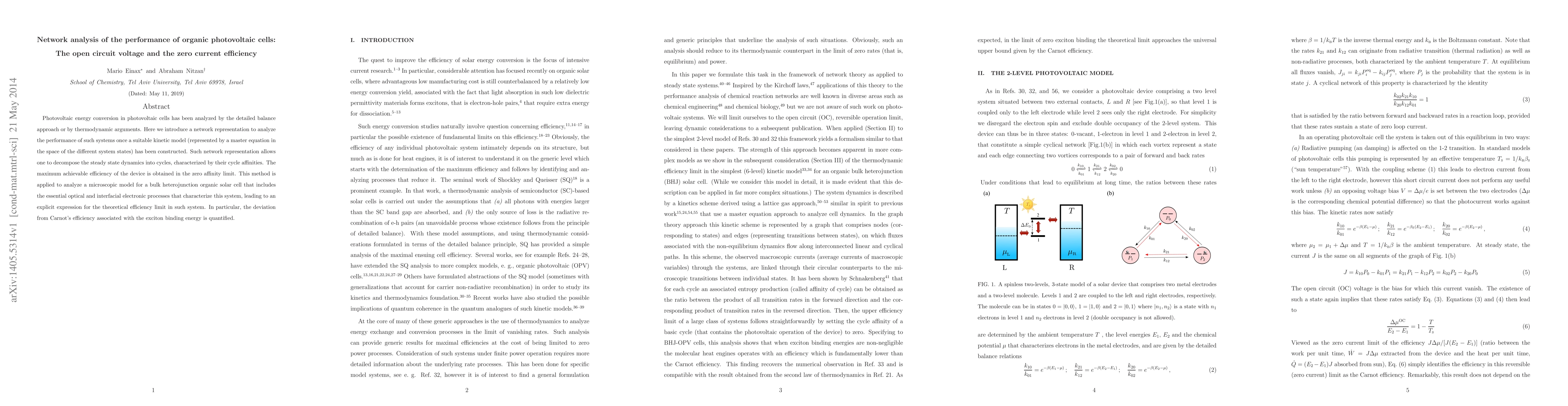 This paper introduces a network analysis method to evaluate the performance of organic photovoltaic cells, focusing on the open circuit voltage and zero current efficiency. It applies this approach to a microscopic model of bulk heterojunction organic solar cells, quantifying the efficiency deviation due to exciton binding energy.