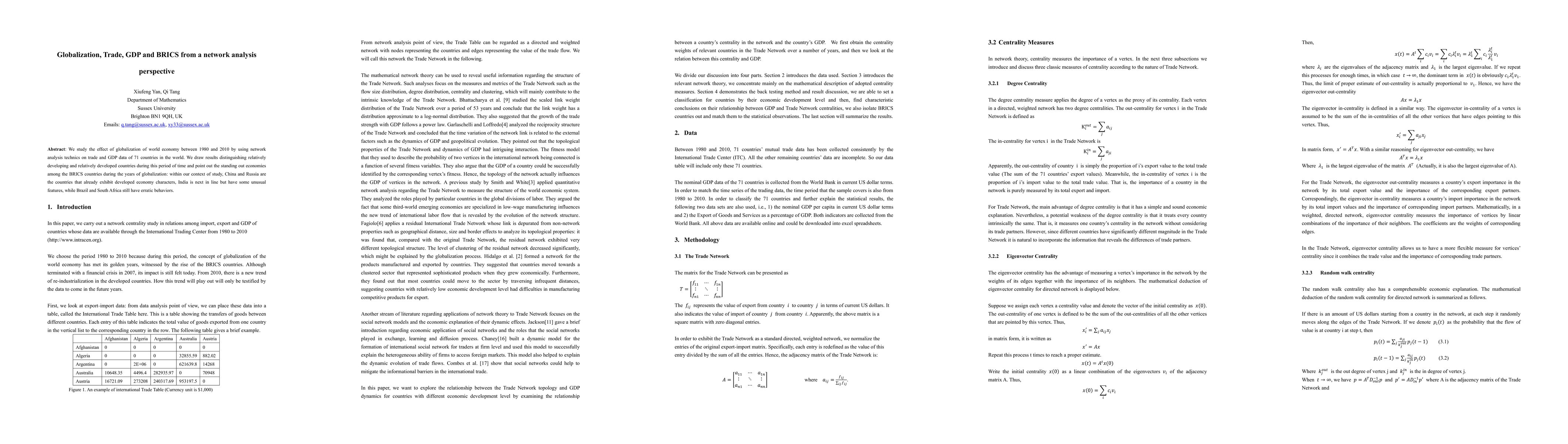 We study the effect of globalization of world economy between 1980 and 2010 by using network analysis technics on trade and GDP data of 71 countries in the world. We draw results distinguishing relatively developing and relatively developed countries during this period of time and point out the standing out economies among the BRICS countries during the years of globalization: within our context of study, China and Russia are the countries that already exhibit developed economy characters, India is next in line but have some unusual features, while Brazil and South Africa still have erratic behaviors