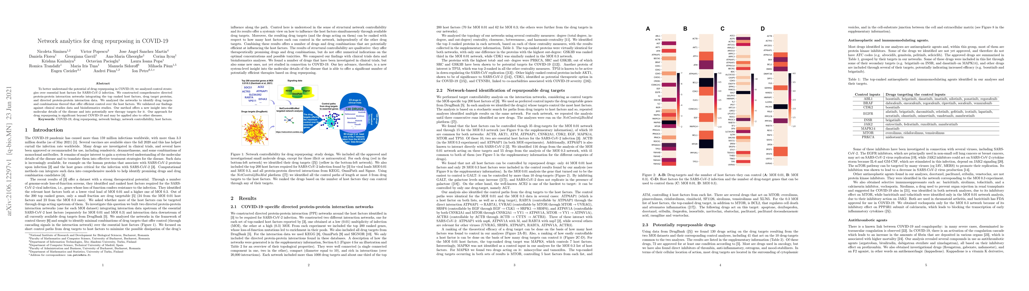 To better understand the potential of drug repurposing in COVID-19, we analyzed control strategies over essential host factors for SARS-CoV-2 infection. We constructed comprehensive directed protein-protein interaction networks integrating the top ranked host factors, drug target proteins, and directed protein-protein interaction data. We analyzed the networks to identify drug targets and combinations thereof that offer efficient control over the host factors. We validated our findings against clinical studies data and bioinformatics studies. Our method offers a new insight into the molecular details of the disease and into potentially new therapy targets for it. Our approach for drug repurposing is significant beyond COVID-19 and may be applied also to other diseases.