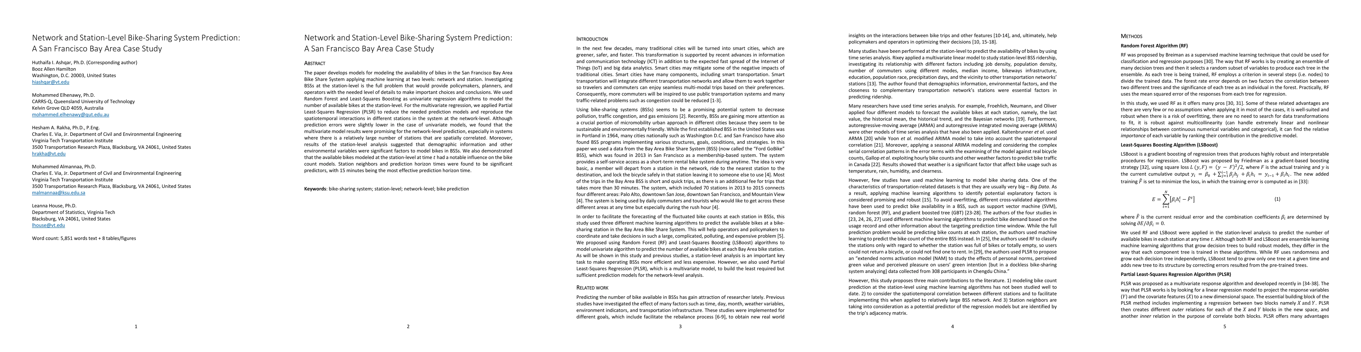 This paper develops machine learning models to predict bike availability in the San Francisco Bay Area Bike Share System at both network and station levels, employing Random Forest, Least-Squares Boosting, and Partial Least-Squares Regression. The study finds that multivariate models are promising for network-level predictions, especially in systems with many spatially correlated stations.