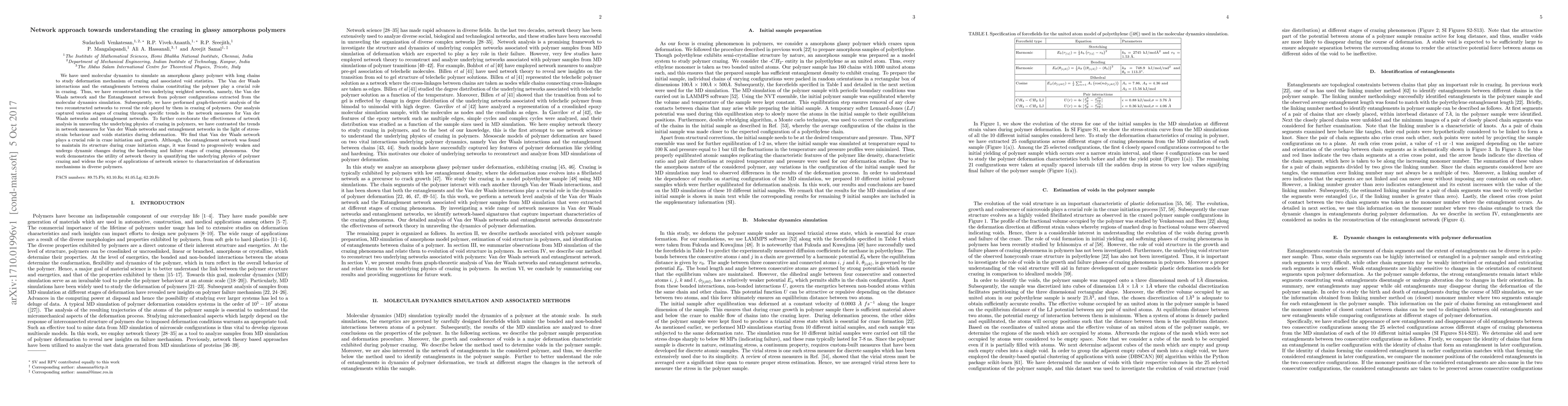 This research uses molecular dynamics simulations to study crazing in amorphous glassy polymers, focusing on Van der Waals interactions and chain entanglements. Network theory analysis of reconstructed Van der Waals and Entanglement networks reveals crucial roles in crazing initiation and growth, with the Van der Waals network playing a primary role in craze formation, while the entanglement network undergoes dynamic changes during deformation.