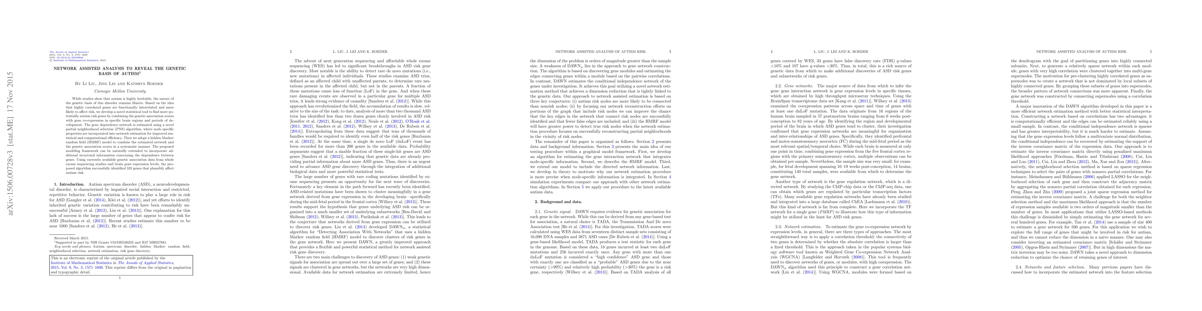 While studies show that autism is highly heritable, the nature of the genetic basis of this disorder remains illusive. Based on the idea that highly correlated genes are functionally interrelated and more likely to affect risk, we develop a novel statistical tool to find more potentially autism risk genes by combining the genetic association scores with gene co-expression in specific brain regions and periods of development. The gene dependence network is estimated using a novel partial neighborhood selection (PNS) algorithm, where node specific properties are incorporated into network estimation for improved statistical and computational efficiency. Then we adopt a hidden Markov random field (HMRF) model to combine the estimated network and the genetic association scores in a systematic manner. The proposed modeling framework can be naturally extended to incorporate additional structural information concerning the dependence between genes. Using currently available genetic association data from whole exome sequencing studies and brain gene expression levels, the proposed algorithm successfully identified 333 genes that plausibly affect autism risk.