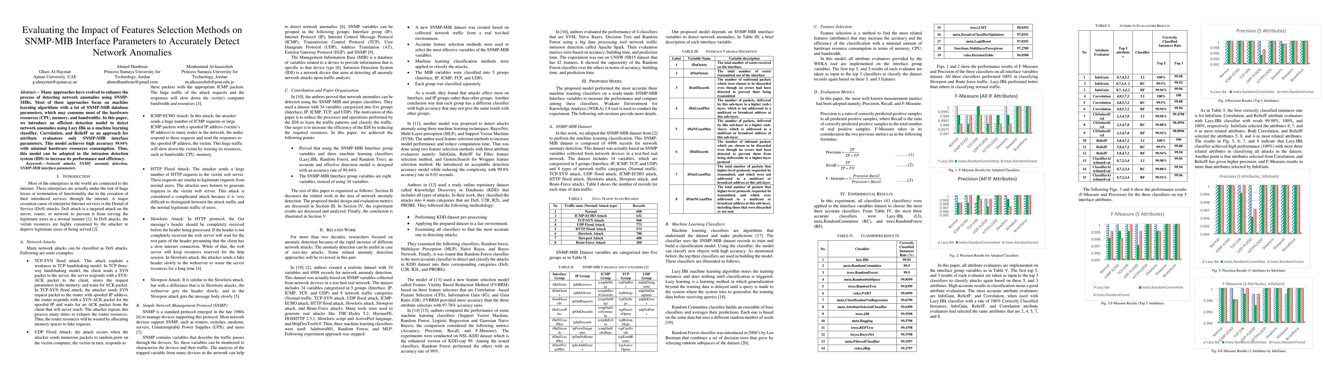Many approaches have evolved to enhance network attacks detection anomaly using SNMP-MIBs. Most of these approaches focus on machine learning algorithms with a lot of SNMP-MIB database parameters, which may consume most of hardware resources (CPU, memory, and bandwidth). In this paper we introduce an efficient detection model to detect network attacks anomaly using Lazy.IBk as a machine learning classifier and Correlation, and ReliefF as attribute evaluators on SNMP-MIB interface parameters. This model achieved accurate results (100%) with minimal hardware resources consumption. Thus, this model can be adopted in intrusion detection system (IDS) to increase its performance and efficiency.