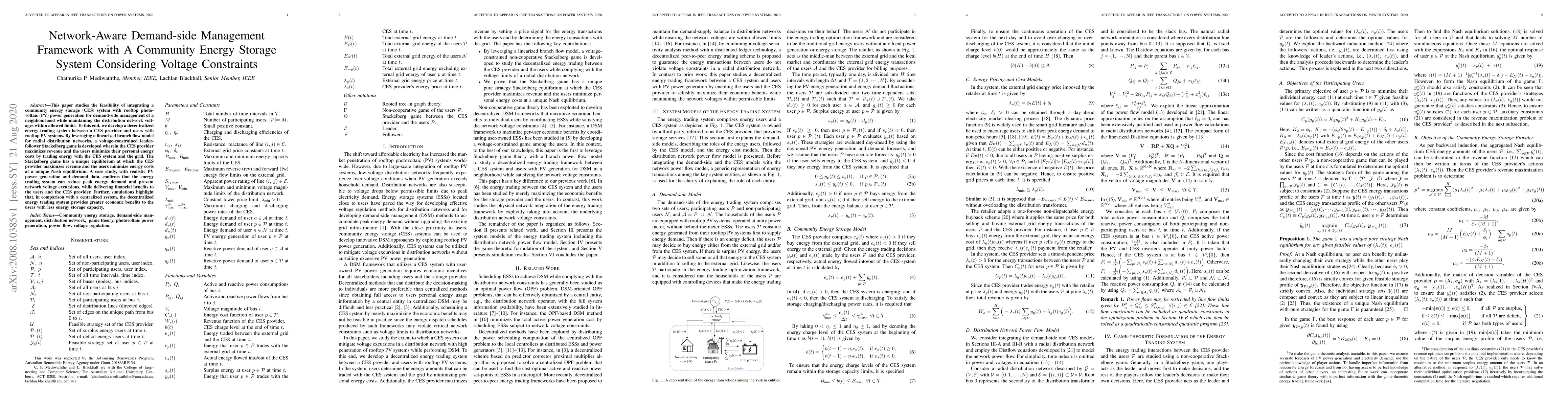This paper proposes a decentralized energy trading system integrating a community energy storage (CES) with rooftop PV systems for demand-side management, ensuring voltage constraints are met. The system leverages a Stackelberg game to optimize revenue for the CES provider and minimize user energy costs, demonstrating reduced peak demand and voltage issues in a case study.