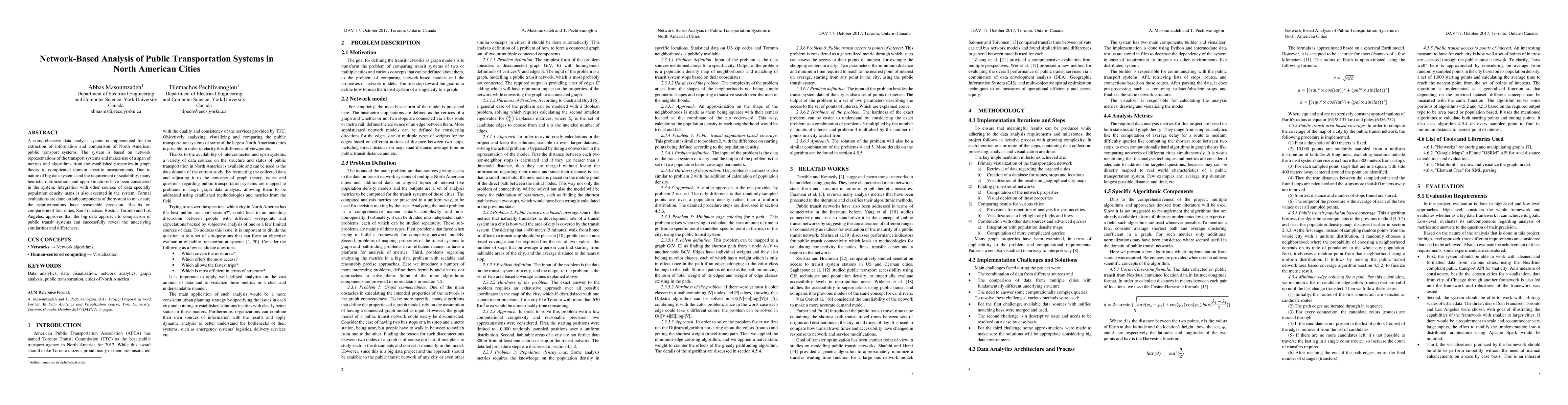 This paper implements a data analysis system for comparing North American public transport networks using graph theory metrics and big data techniques. The system integrates population density data and employs heuristic optimizations for scalability, with formal evaluations ensuring approximation precision, and results show successful comparison of transit systems in San Francisco, Boston, Toronto, and Los Angeles.