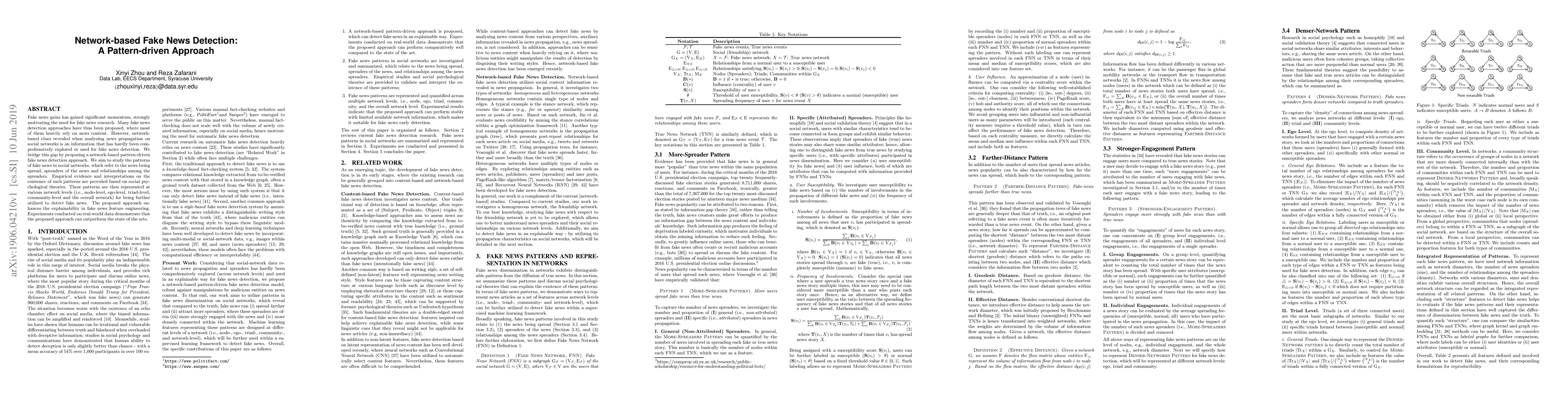 This paper proposes a novel network-based pattern-driven approach for detecting fake news by analyzing social network propagation patterns, including spreaders and relationships. The method enhances feature engineering explainability and outperforms existing methods on real-world data.