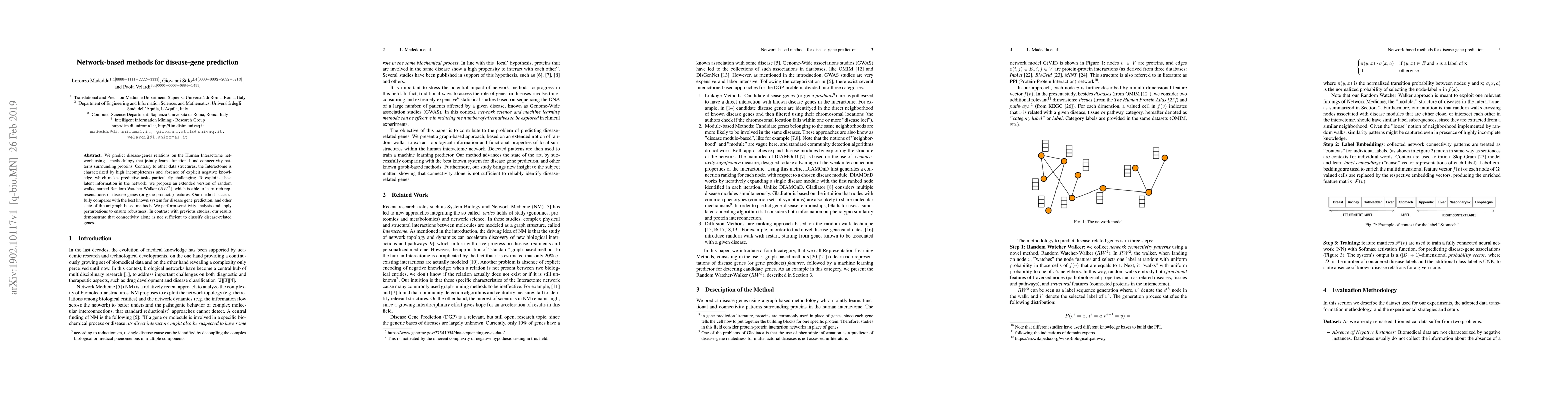 We predict disease-genes relations on the Human Interactome network using a methodology that jointly learns functional and connectivity patterns surrounding proteins. Contrary to other data structures, the Interactome is characterized by high incompleteness and absence of explicit negative knowledge, which makes predictive tasks particularly challenging. To exploit at best latent information in the network, we propose an extended version of random walks, named Random Watcher-Walker ($RW^2$), which is able to learn rich representations of disease genes (or gene products) features. Our method successfully compares with the best known system for disease gene prediction, and other state-of-the-art graph-based methods. We perform sensitivity analysis and apply perturbations to ensure robustness. In contrast with previous studies, our results demonstrate that connectivity alone is not sufficient to classify disease-related genes.