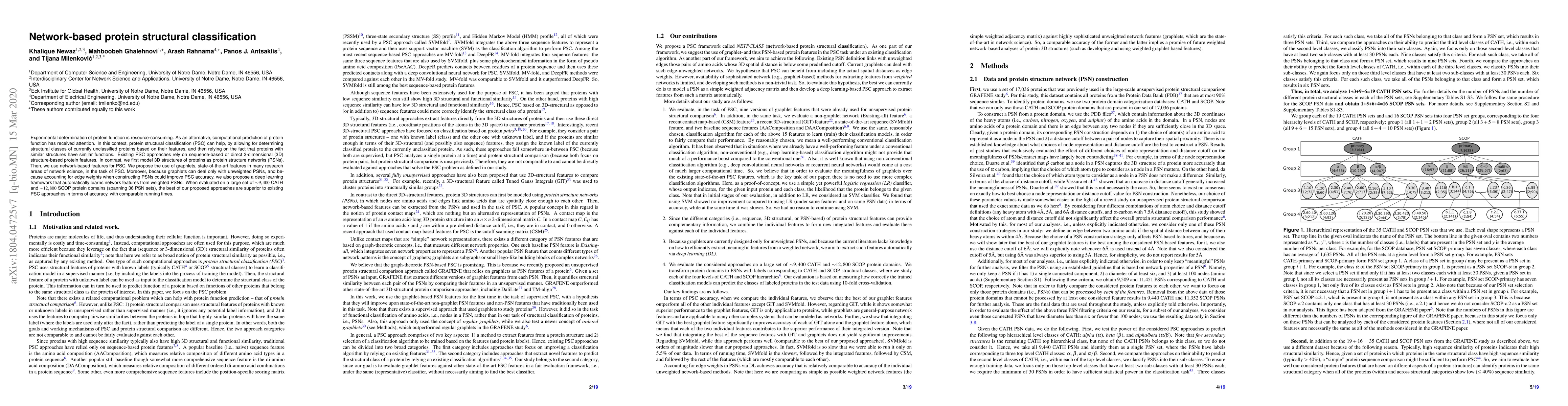 This paper proposes network-based protein structural classification using graphlet features from protein structure networks and a deep learning framework for weighted networks, achieving superior accuracy compared to existing sequence-based or 3D structure-based methods. The approaches demonstrate effectiveness on large datasets of CATH and SCOP protein domains.