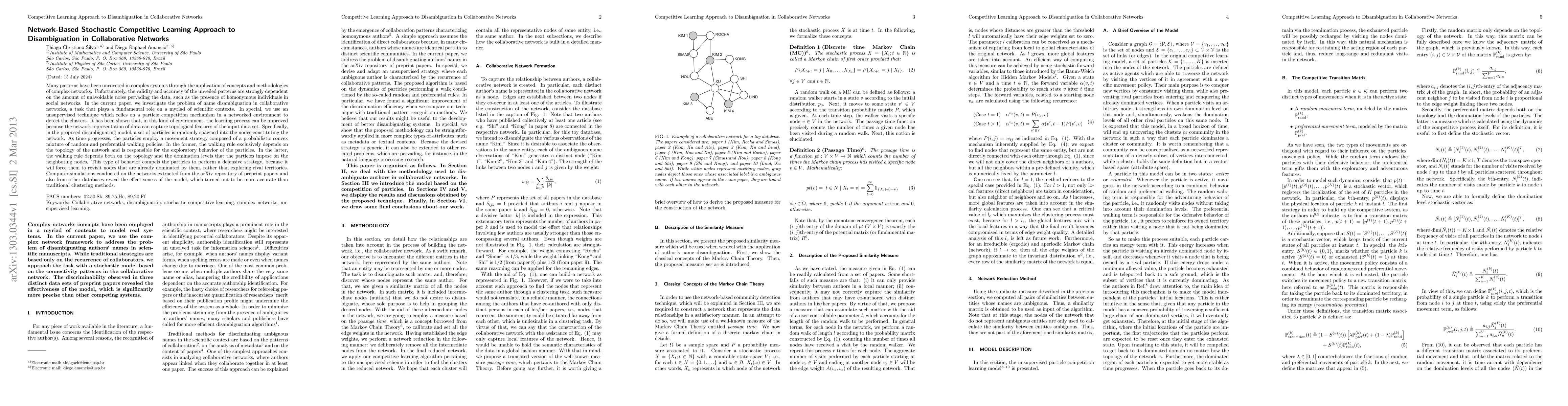 Many patterns have been uncovered in complex systems through the application of concepts and methodologies of complex networks. Unfortunately, the validity and accuracy of the unveiled patterns are strongly dependent on the amount of unavoidable noise pervading the data, such as the presence of homonymous individuals in social networks. In the current paper, we investigate the problem of name disambiguation in collaborative networks, a task that plays a fundamental role on a myriad of scientific contexts. In special, we use an unsupervised technique which relies on a particle competition mechanism in a networked environment to detect the clusters. It has been shown that, in this kind of environment, the learning process can be improved because the network representation of data can capture topological features of the input data set. Specifically, in the proposed disambiguating model, a set of particles is randomly spawned into the nodes constituting the network. As time progresses, the particles employ a movement strategy composed of a probabilistic convex mixture of random and preferential walking policies. In the former, the walking rule exclusively depends on the topology of the network and is responsible for the exploratory behavior of the particles. In the latter, the walking rule depends both on the topology and the domination levels that the particles impose on the neighboring nodes. This type of behavior compels the particles to perform a defensive strategy, because it will force them to revisit nodes that are already dominated by them, rather than exploring rival territories. Computer simulations conducted on the networks extracted from the arXiv repository of preprint papers and also from other databases reveal the effectiveness of the model, which turned out to be more accurate than traditional clustering methods.