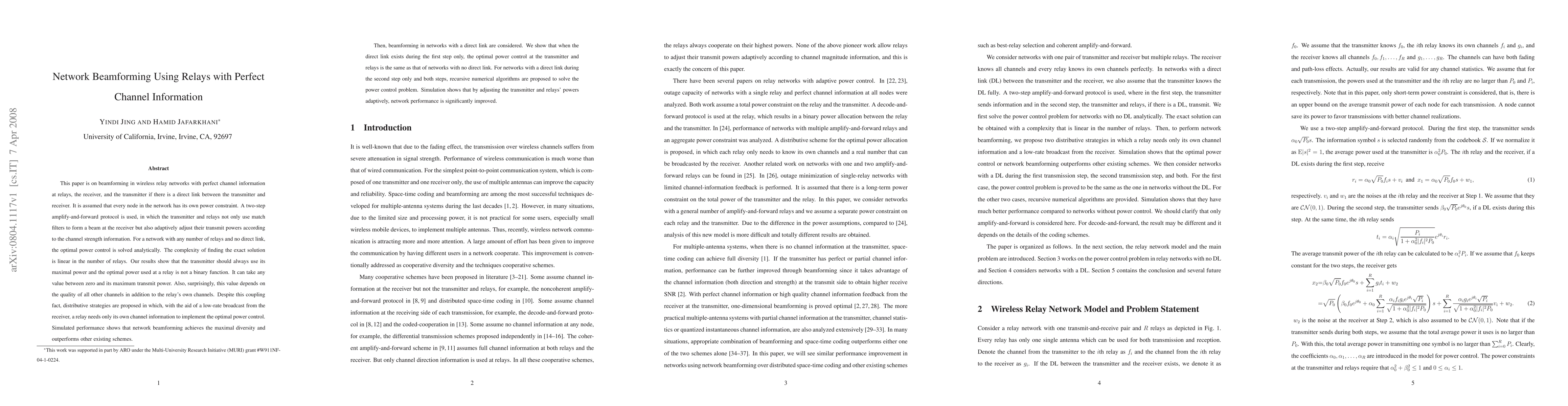 This paper investigates network beamforming in wireless relay networks with perfect channel information, employing a two-step amplify-and-forward protocol. It analytically solves optimal power control for networks without direct links, showing that relays can use any power between zero and maximum, depending on all channel qualities.