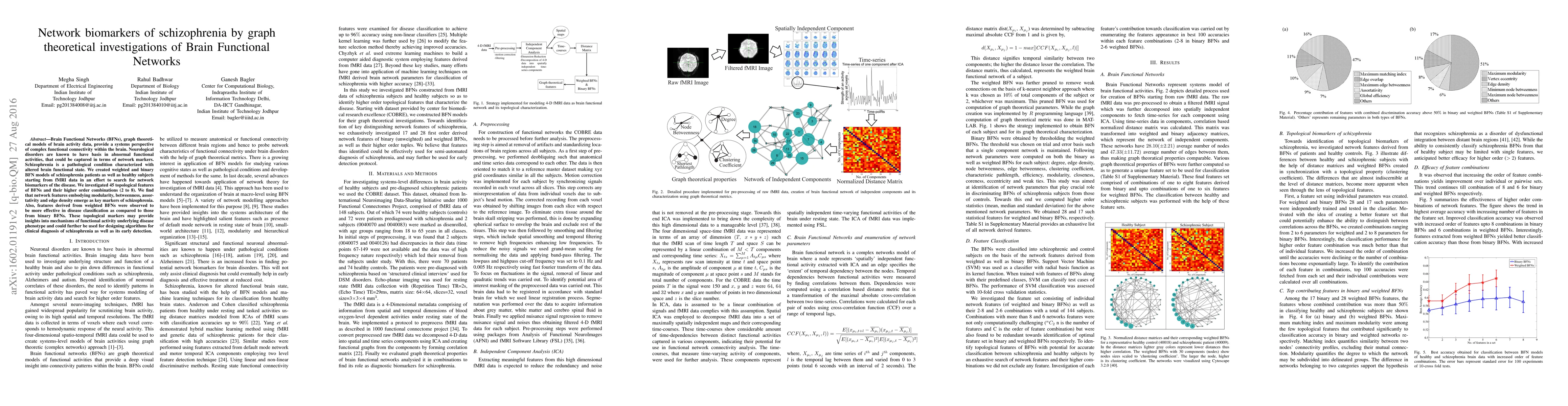 This paper investigates brain functional networks (BFNs) using graph theory to identify network biomarkers for schizophrenia. The study finds that topological features like modularity, betweenness, and edge density in weighted BFN models are significant markers, with weighted BFN features proving more effective in classifying schizophrenia than binary BFN features. These findings could aid in understanding the disease's underlying mechanisms and improve diagnostic algorithms.