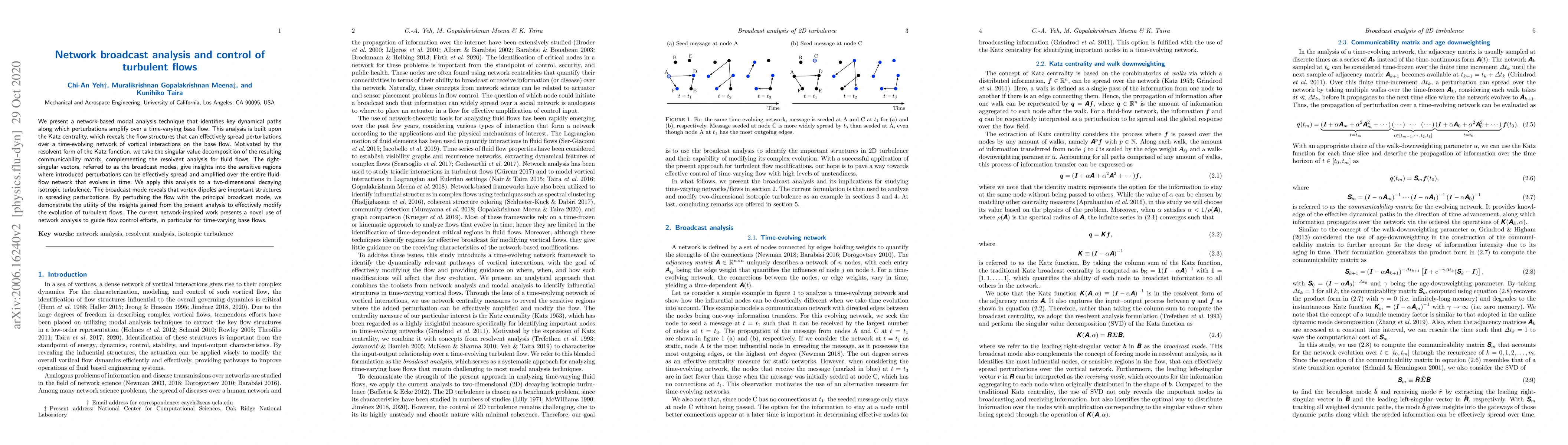 The research employs a network-based modal analysis technique that identifies key dynamical paths in turbulent flows using Katz centrality, revealing flow structures that effectively spread perturbations over time-evolving networks of vortical interactions.
