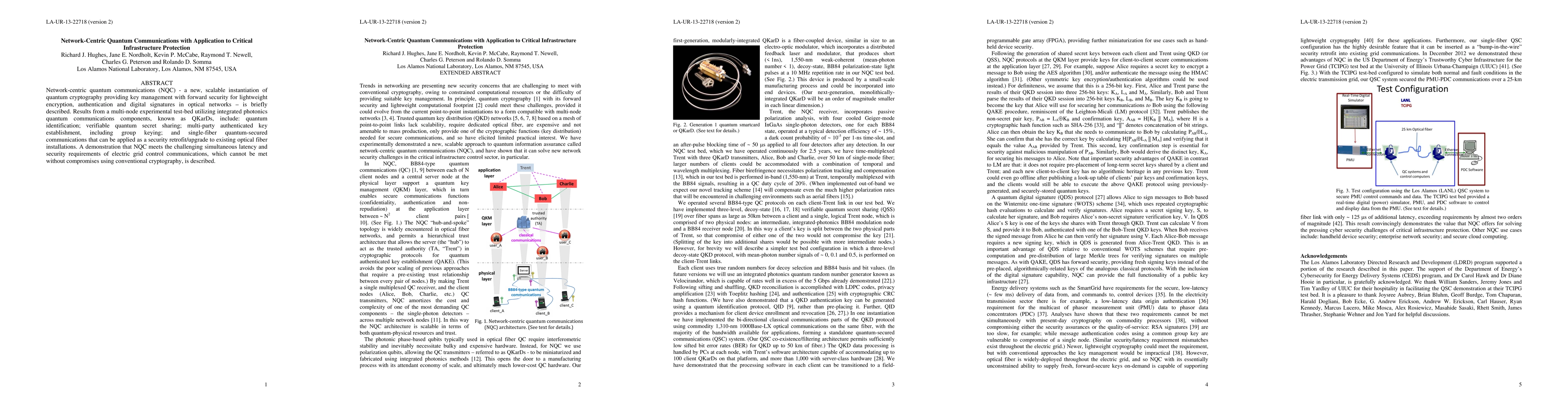 Network-centric quantum communications (NQC) - a new, scalable instantiation of quantum cryptography providing key management with forward security for lightweight encryption, authentication and digital signatures in optical networks - is briefly described. Results from a multi-node experimental test-bed utilizing integrated photonics quantum communications components, known as QKarDs, include: quantum identification; verifiable quantum secret sharing; multi-party authenticated key establishment, including group keying; and single-fiber quantum-secured communications that can be applied as a security retrofit/upgrade to existing optical fiber installations. A demonstration that NQC meets the challenging simultaneous latency and security requirements of electric grid control communications, which cannot be met without compromises using conventional cryptography, is described.