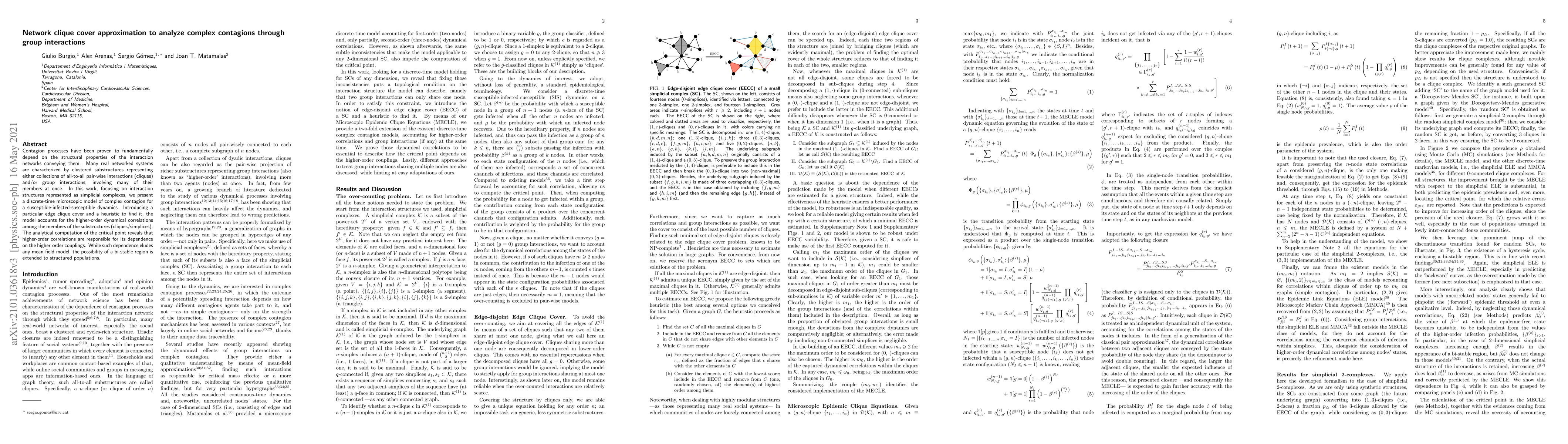 Contagion processes have been proven to fundamentally depend on the structural properties of the interaction networks conveying them. Many real networked systems are characterized by clustered substructures representing either collections of all-to-all pair-wise interactions (cliques) and/or group interactions, involving many of their members at once. In this work, focusing on interaction structures represented as simplicial complexes, we present a discrete-time microscopic model of complex contagion for a susceptible-infected-susceptible dynamics. Introducing a particular edge clique cover and a heuristic to find it, the model accounts for the higher-order dynamical correlations among the members of the substructures (cliques/simplices). The analytical computation of the critical point reveals that higher-order correlations are responsible for its dependence on the higher-order couplings. While such dependence eludes any mean-field model, the possibility of a bi-stable region is extended to structured populations.