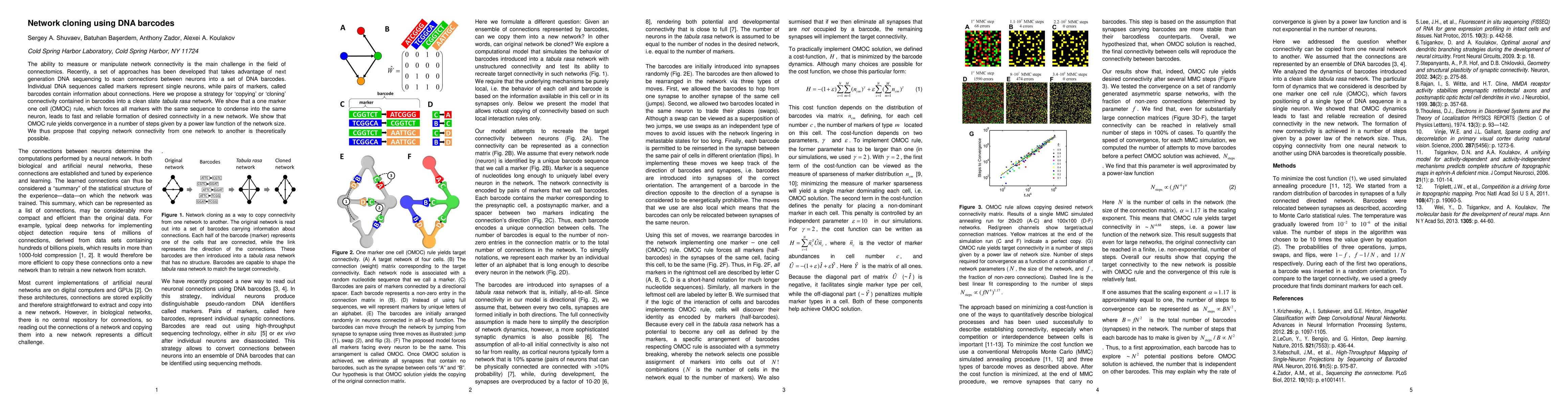 The ability to measure or manipulate network connectivity is the main challenge in the field of connectomics. Recently, a set of approaches has been developed that takes advantage of next generation DNA sequencing to scan connections between neurons into a set of DNA barcodes. Individual DNA sequences called markers represent single neurons, while pairs of markers, called barcodes contain information about connections. Here we propose a strategy for 'copying' or 'cloning' connectivity contained in barcodes into a clean slate tabula rasa network. We show that a one marker one cell (OMOC) rule, which forces all markers with the same sequence to condense into the same neuron, leads to fast and reliable formation of desired connectivity in a new network. We show that OMOC rule yields convergence in a number of steps given by a power law function of the network size. We thus propose that copying network connectivity from one network to another is theoretically possible.