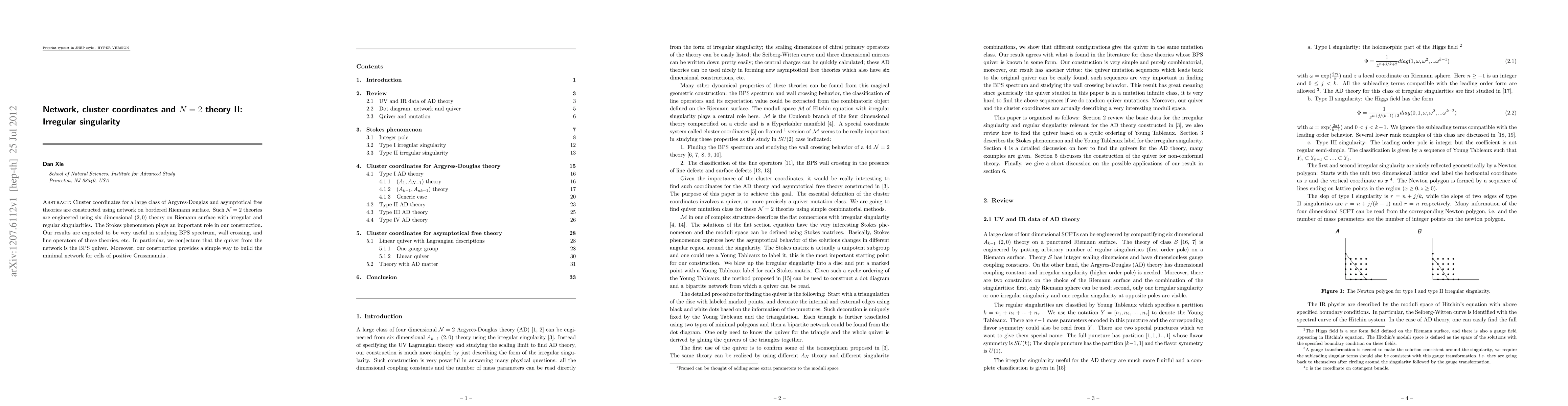 Cluster coordinates for a large class of Argyres-Douglas and asymptotical free theories are constructed using network on bordered Riemann surface. Such N = 2 theories are engineered using six dimensional (2, 0) theory on Riemann surface with irregular and regular singularities. The Stokes phenomenon plays an important role in our construction. Our results are expected to be very useful in studying BPS spectrum, wall crossing, and line operators of these theories, etc. In particular, we conjecture that the quiver from the network is the BPS quiver. Moreover, our construction provides a simple way to build the minimal network for cells of positive Grassmannia .