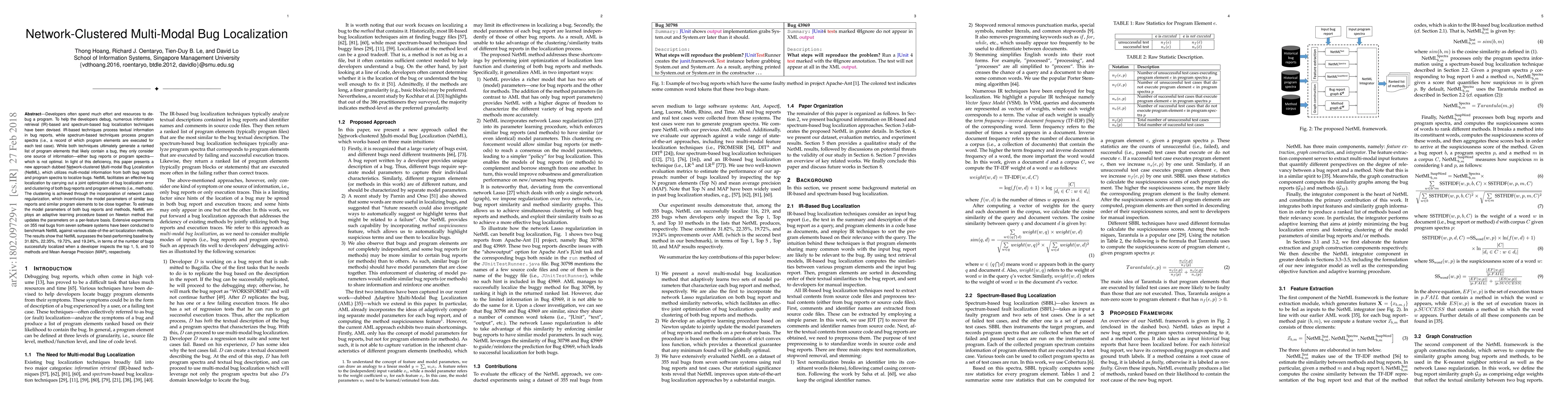 This paper introduces Network-clustered Multi-modal Bug Localization (NetML), a novel approach that combines textual bug reports and program spectra for more effective bug localization. NetML employs network Lasso regularization and adaptive learning to optimize bug localization and cluster similar bug reports and program elements, outperforming state-of-the-art methods by 31.82% to 19.24% in various metrics.