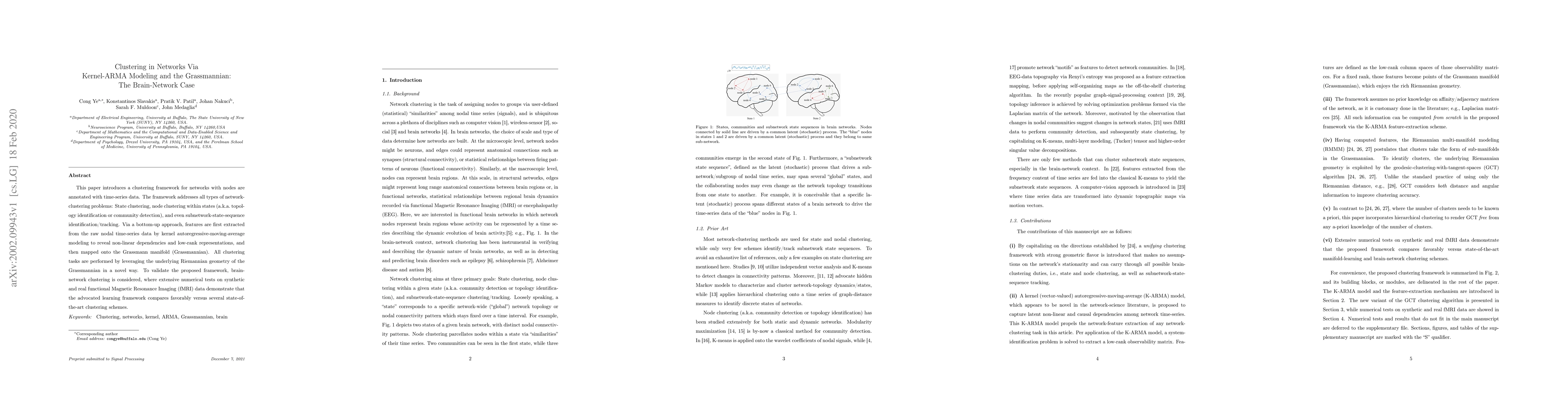 This paper introduces a clustering framework for networks with nodes annotated with time-series data. The framework addresses all types of network-clustering problems: State clustering, node clustering within states (a.k.a. topology identification or community detection), and even subnetwork-state-sequence identification/tracking. Via a bottom-up approach, features are first extracted from the raw nodal time-series data by kernel autoregressive-moving-average modeling to reveal non-linear dependencies and low-rank representations, and then mapped onto the Grassmann manifold (Grassmannian). All clustering tasks are performed by leveraging the underlying Riemannian geometry of the Grassmannian in a novel way. To validate the proposed framework, brain-network clustering is considered, where extensive numerical tests on synthetic and real functional magnetic resonance imaging (fMRI) data demonstrate that the advocated learning framework compares favorably versus several state-of-the-art clustering schemes.