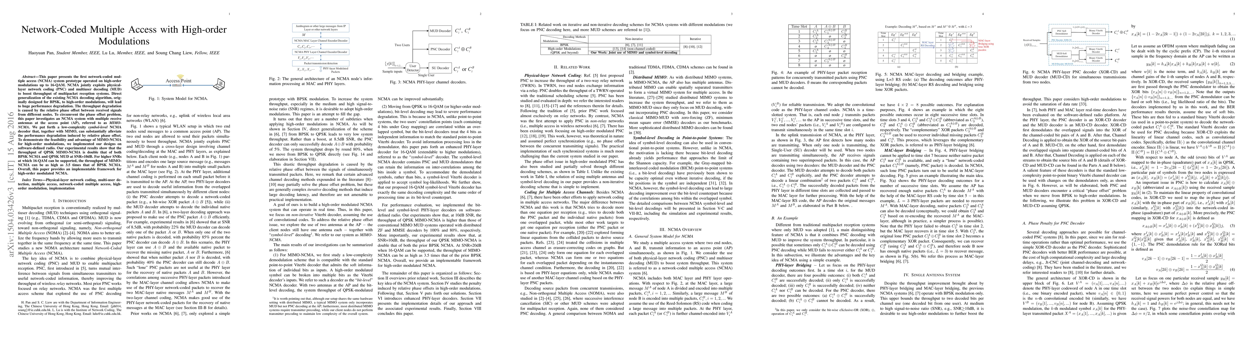 This paper introduces a network-coded multiple access (NCMA) system using high-order modulations up to 16-QAM, addressing performance degradation due to phase offset with a low-complexity MIMO-NCMA decoder. Experimental results show significant throughput improvements over traditional NCMA and multiuser decoding methods.