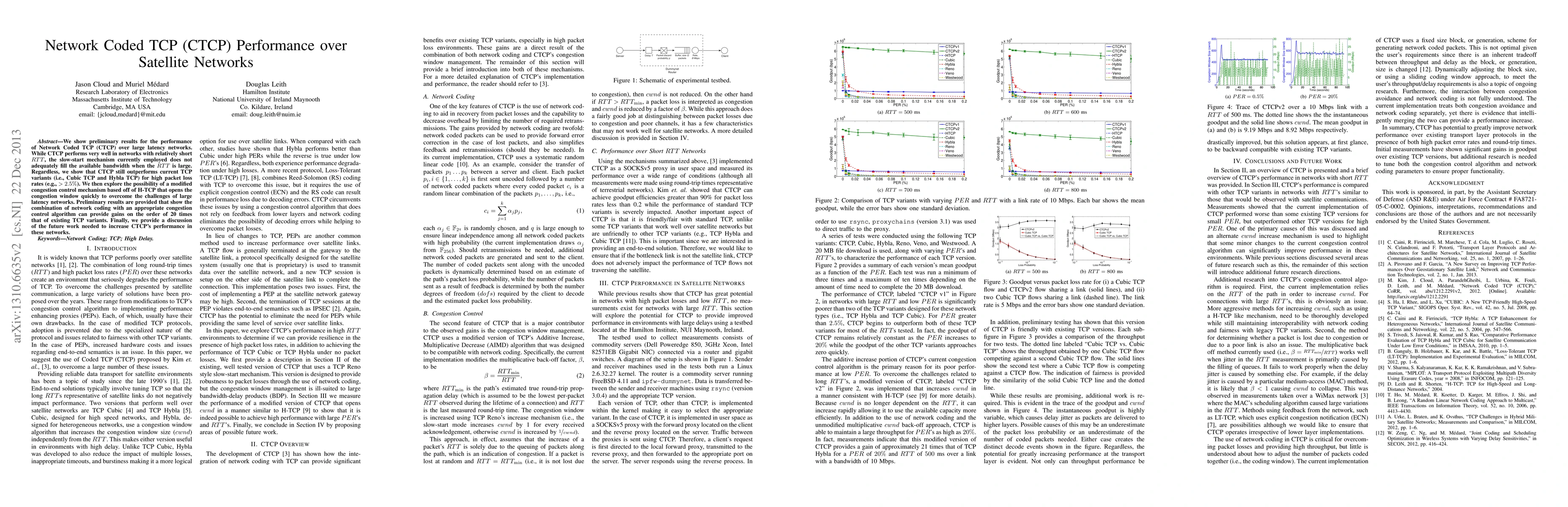 This paper evaluates Network Coded TCP (CTCP) over satellite networks, demonstrating its superior performance over traditional TCP variants in high packet loss scenarios. Despite challenges with large round-trip times, CTCP shows potential for significant bandwidth gains when combined with a modified congestion control mechanism inspired by H-TCP.