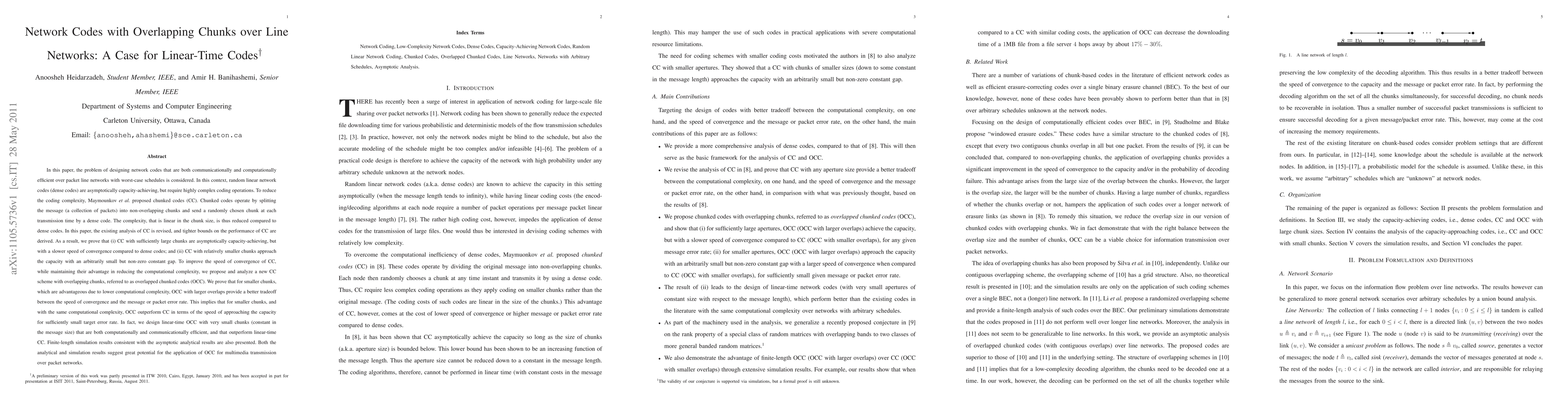 This paper revises chunked codes (CC) for network coding over packet line networks, showing that they achieve capacity with a slower convergence compared to dense codes. It introduces overlapped chunked codes (OCC) with overlapping chunk structures to improve convergence speed while maintaining lower computational complexity, proving that OCC outperforms CC in terms of speed for small chunks and small error rates.