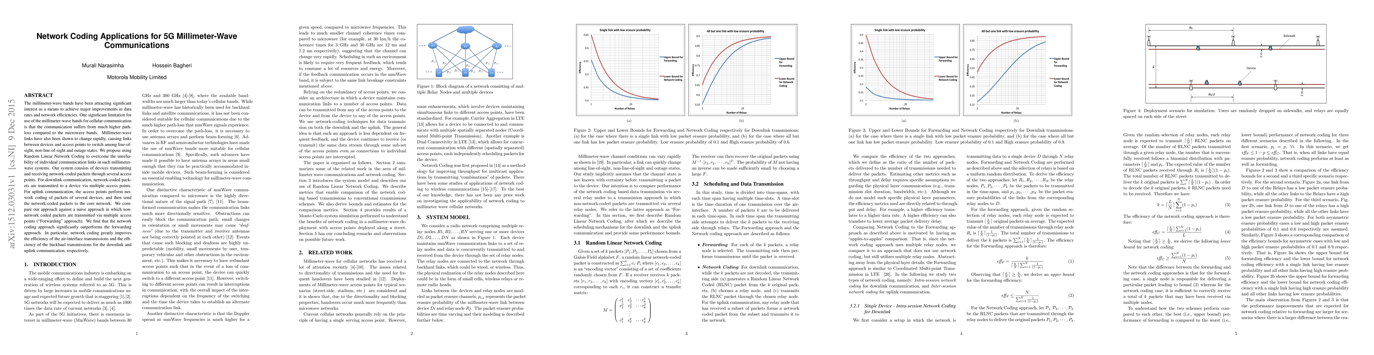 This paper proposes using Random Linear Network Coding to enhance the reliability and efficiency of 5G millimeter-wave communications, which suffer from high path-loss and rapid link changes. The network coding approach outperforms a simple forwarding method by significantly improving both downlink and uplink transmission efficiencies.