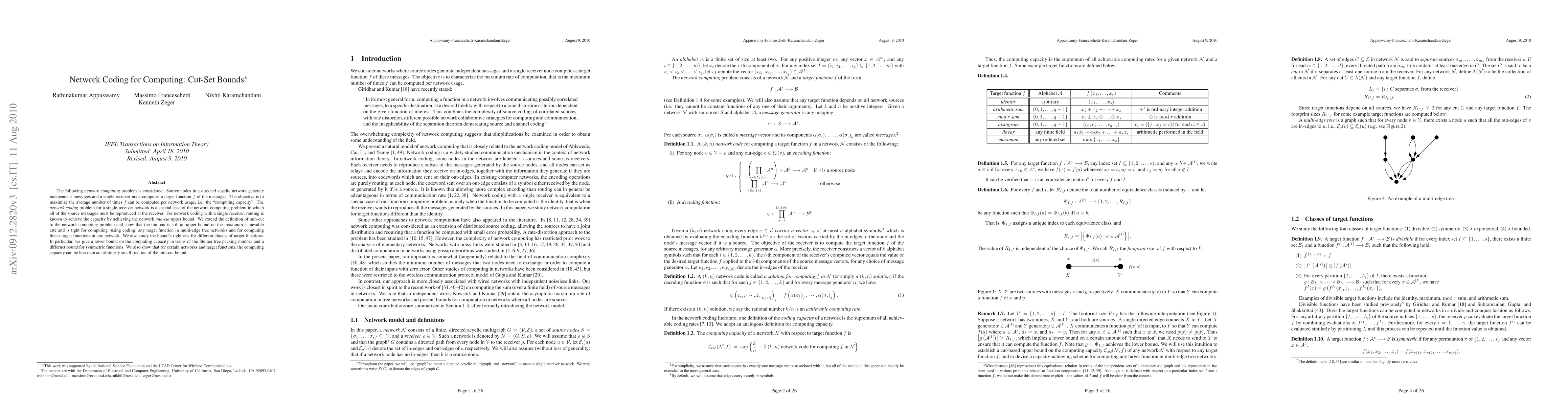 This paper explores network computing in directed acyclic networks, focusing on maximizing the "computing capacity" by using network coding. It extends the min-cut concept to show that it remains an upper bound for computing capacities, proving its tightness for specific target functions in various network structures.