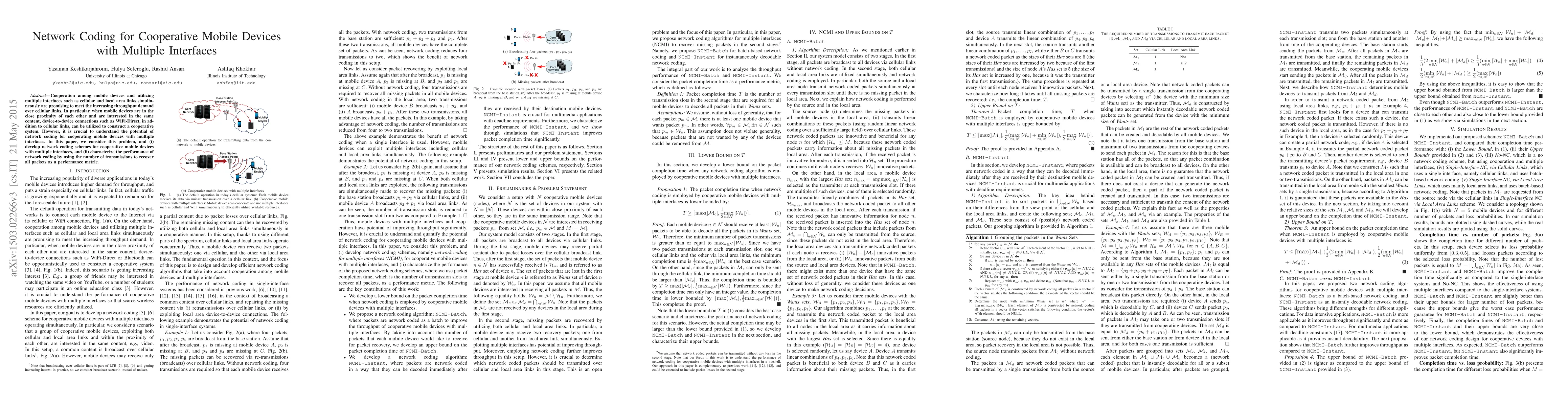 This paper develops network coding schemes for mobile devices using multiple interfaces to enhance cooperative communication. It evaluates the performance of these schemes by measuring the number of transmissions required to recover all packets, aiming to meet the increasing throughput demands over cellular links.