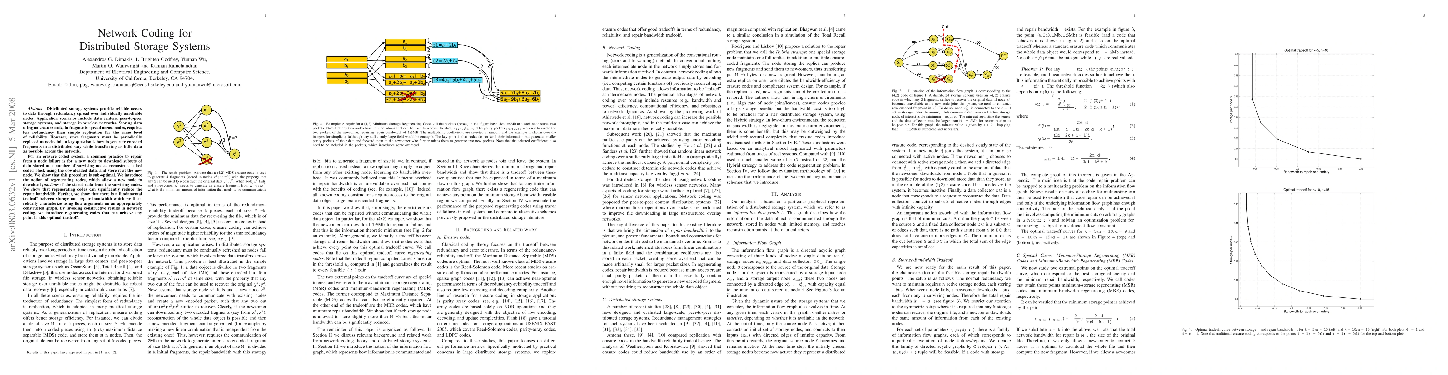 Distributed storage systems provide reliable access to data through redundancy spread over individually unreliable nodes. Application scenarios include data centers, peer-to-peer storage systems, and storage in wireless networks. Storing data using an erasure code, in fragments spread across nodes, requires less redundancy than simple replication for the same level of reliability. However, since fragments must be periodically replaced as nodes fail, a key question is how to generate encoded fragments in a distributed way while transferring as little data as possible across the network. For an erasure coded system, a common practice to repair from a node failure is for a new node to download subsets of data stored at a number of surviving nodes, reconstruct a lost coded block using the downloaded data, and store it at the new node. We show that this procedure is sub-optimal. We introduce the notion of regenerating codes, which allow a new node to download \emph{functions} of the stored data from the surviving nodes. We show that regenerating codes can significantly reduce the repair bandwidth. Further, we show that there is a fundamental tradeoff between storage and repair bandwidth which we theoretically characterize using flow arguments on an appropriately constructed graph. By invoking constructive results in network coding, we introduce regenerating codes that can achieve any point in this optimal tradeoff.