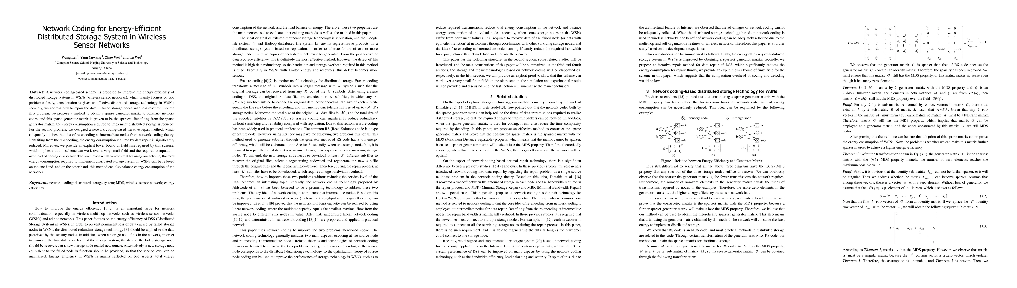 The paper proposes a network coding-based scheme for energy-efficient distributed storage systems in wireless sensor networks (WSNs), addressing two main problems: effective distributed storage technology and data repair in failed nodes with minimal resources.