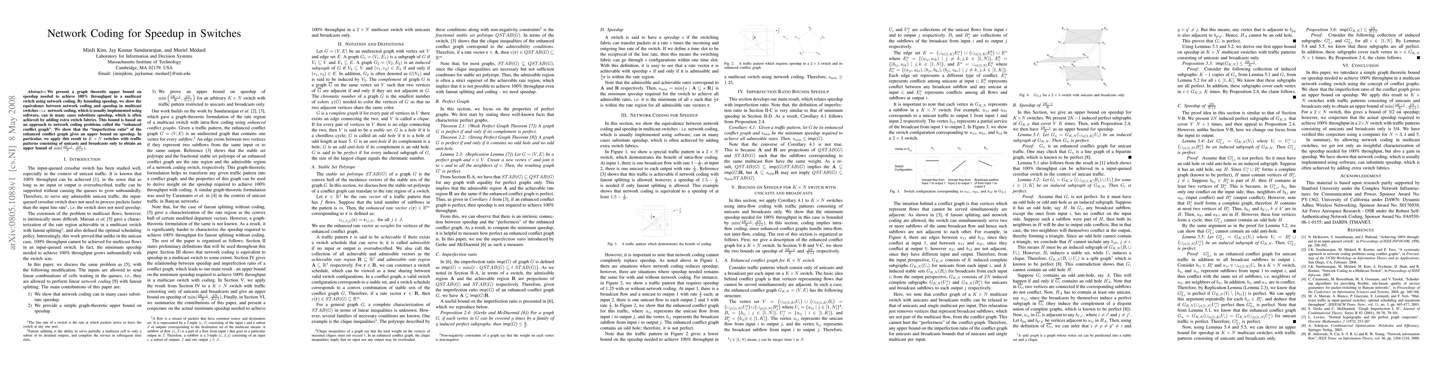 This paper establishes a graph theoretic upper bound on the speedup required to achieve 100% throughput in multicast switches using network coding, demonstrating that network coding can often replace additional hardware speedup. The "enhanced conflict graph" and its "imperfection ratio" are used to derive this bound, which is applied to K-by-N switches with unicast and broadcast traffic.