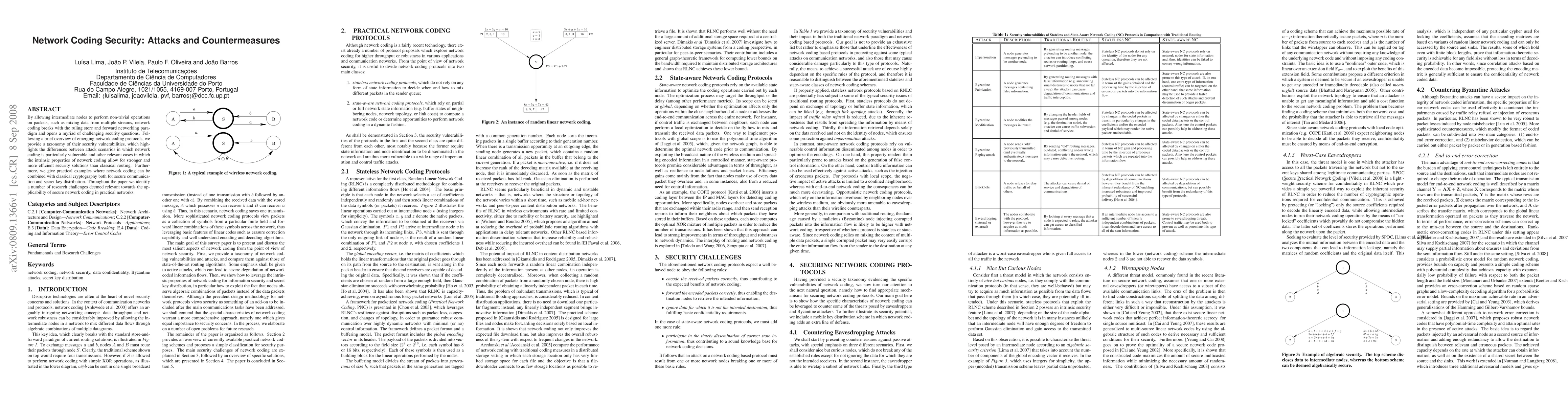 This paper explores security vulnerabilities in network coding, contrasting them with traditional store and forward paradigms, and proposes countermeasures. It outlines various attack scenarios and highlights how network coding can enhance security through efficient cryptographic solutions, while also identifying key research challenges for its practical implementation.
