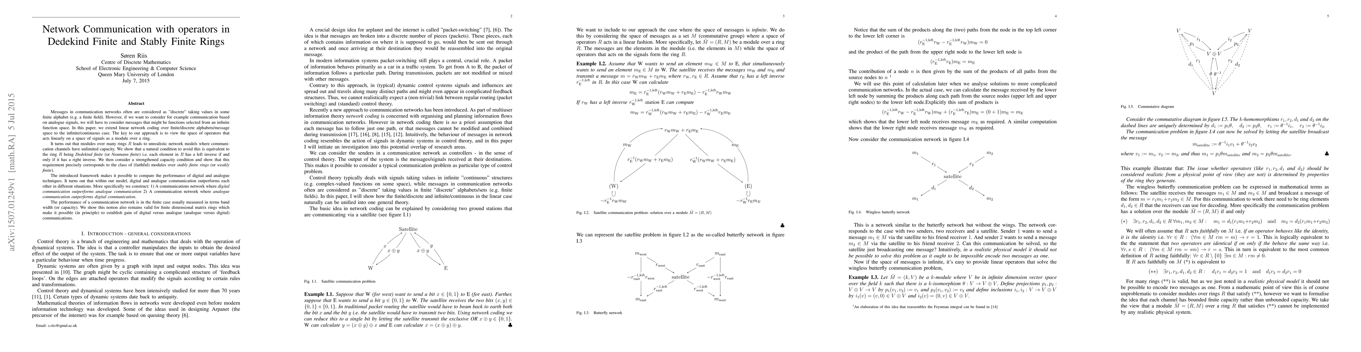 Messages in communication networks often are considered as "discrete" taking values in some finite alphabet (e.g. a finite field). However, if we want to consider for example communication based on analogue signals, we will have to consider messages that might be functions selected from an infinite function space. In this paper, we extend linear network coding over finite/discrete alphabets/message space to the infinite/continuous case. The key to our approach is to view the space of operators that acts linearly on a space of signals as a module over a ring. It turns out that modules over many rings $R$ leads to unrealistic network models where communication channels have unlimited capacity. We show that a natural condition to avoid this is equivalent to the ring $R$ being Dedekind finite (or Neumann finite) i.e. each element in $R$ has a left inverse if and only if it has a right inverse. We then consider a strengthened capacity condition and show that this requirement precisely corresponds to the class of (faithful) modules over stably finite rings (or weakly finite). The introduced framework makes it possible to compare the performance of digital and analogue techniques. It turns out that within our model, digital and analogue communication outperforms each other in different situations. More specifically we construct: 1) A communications network where digital communication outperforms analogue communication. 2) A communication network where analogue communication outperforms digital communication. The performance of a communication network is in the finite case usually measured in terms band width (or capacity). We show this notion also remains valid for finite dimensional matrix rings which make it possible (in principle) to establish gain of digital versus analogue (analogue versus digital) communications.