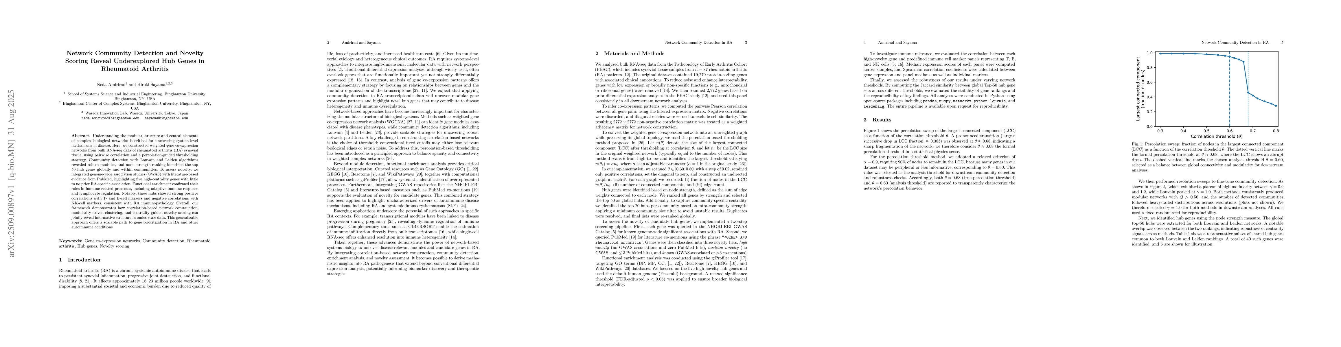 Understanding the modular structure and central elements of complex biological networks is critical for uncovering system-level mechanisms in disease. Here, we constructed weighted gene co-expression networks from bulk RNA-seq data of rheumatoid arthritis (RA) synovial tissue, using pairwise correlation and a percolation-guided thresholding strategy. Community detection with Louvain and Leiden algorithms revealed robust modules, and node-strength ranking identified the top 50 hub genes globally and within communities. To assess novelty, we integrated genome-wide association studies (GWAS) with literature-based evidence from PubMed, highlighting five high-centrality genes with little to no prior RA-specific association. Functional enrichment confirmed their roles in immune-related processes, including adaptive immune response and lymphocyte regulation. Notably, these hubs showed strong positive correlations with T- and B-cell markers and negative correlations with NK-cell markers, consistent with RA immunopathology. Overall, our framework demonstrates how correlation-based network construction, modularity-driven clustering, and centrality-guided novelty scoring can jointly reveal informative structure in omics-scale data. This generalizable approach offers a scalable path to gene prioritization in RA and other autoimmune conditions.